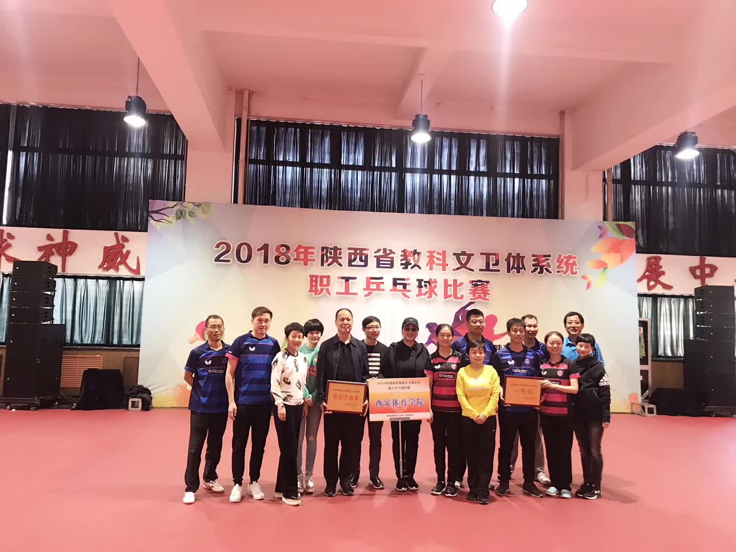 由陕西省教科文卫体工会主办、万象城allwincity官网承办的2018年陕西省教科文卫体系统职工乒乓球比赛于2018年10月27日--28日在我院乒乓球馆举行。全省共有62支代表队参加比赛,经过两天激烈的比赛,我院教工代表队获得冠军。