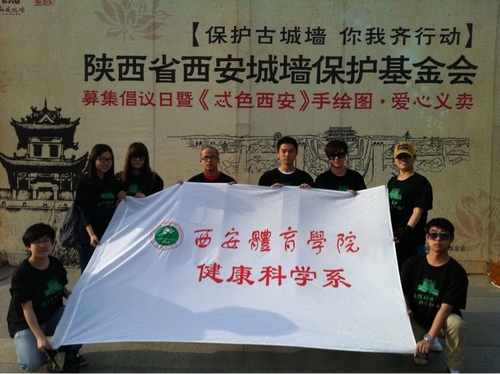 本网讯 4月18日是国际古迹遗址日,为响应西安市保护古城墙的号召,健康科学系学生于当日下午登上南门城墙,参加“保护古城墙,你我齐行动”爱心义卖活动。本次活动所得善款将全部捐给陕西省西安市城墙保护基金会,用于维护和修复古城墙。此次活动得到了西安城墙管理委员会和游客们的充分认可和高度评价。