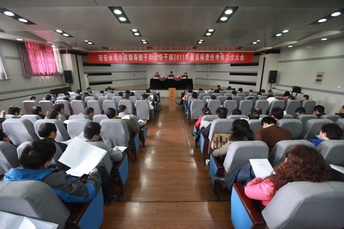 本网讯为进一步加强高等学校领导班子和领导干部队伍建设,改进和完善干部考核评价工作,根据省委、省政府有关要求,3月30日,我院在教学楼一楼报告厅召开万象城allwincity官网领导班子和领导干部2011年度目标责任考核工作大会。陕西省高等学校年度目标责任考核万象城allwincity官网考核工作组组长、省体育局纪检组组长支希贤,省体育局人事处处长马新范,省委组织部宣教处副调研员周群以及考核小组成员可宗革、高志国、甄颖出席大会。学院党委委员、纪委委员、学术委员会委员、工会委员,正高职称专业技术人员,副处级以上干部,市级以上人大代表、政协委员,各民主党派主要负责人,学生代表近150人参加了大会。大会由学院党委书记杜平主持。
