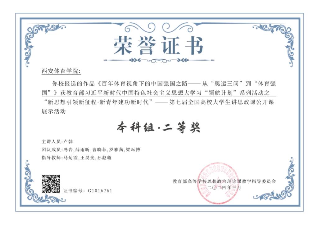 该团队加强冠军资源、体育赛事、红色校史等资源挖掘,做好“特色融入”,开辟了红色体育文化、体育法治教育等具有万象城独有特色的研究领域和方向。获批国家级项目3项、省部级项目20余项,获陕西省哲学社会科学优秀成果奖2项,出版著作5部,编写教材2部。《思想道德与法治》课获批陕西省省级一流本科课程,其余四门主课均为校级一流课程。获批陕西省“习近平新时代中国特色社会主义思想‘三进’省级精品课程项目”2项,获批陕西省“大思政课”建设项目2项。党委书记刘子实教授负责的《体育特色思政教学资源开发与共享研究》获批为陕西“大思政课”教学资源共享平台项目,马克思主义学院秋实教授负责的《“红色体育”大思政课建设》获批为陕西高校“大思政课”建设“一校一品牌”创建项目。
