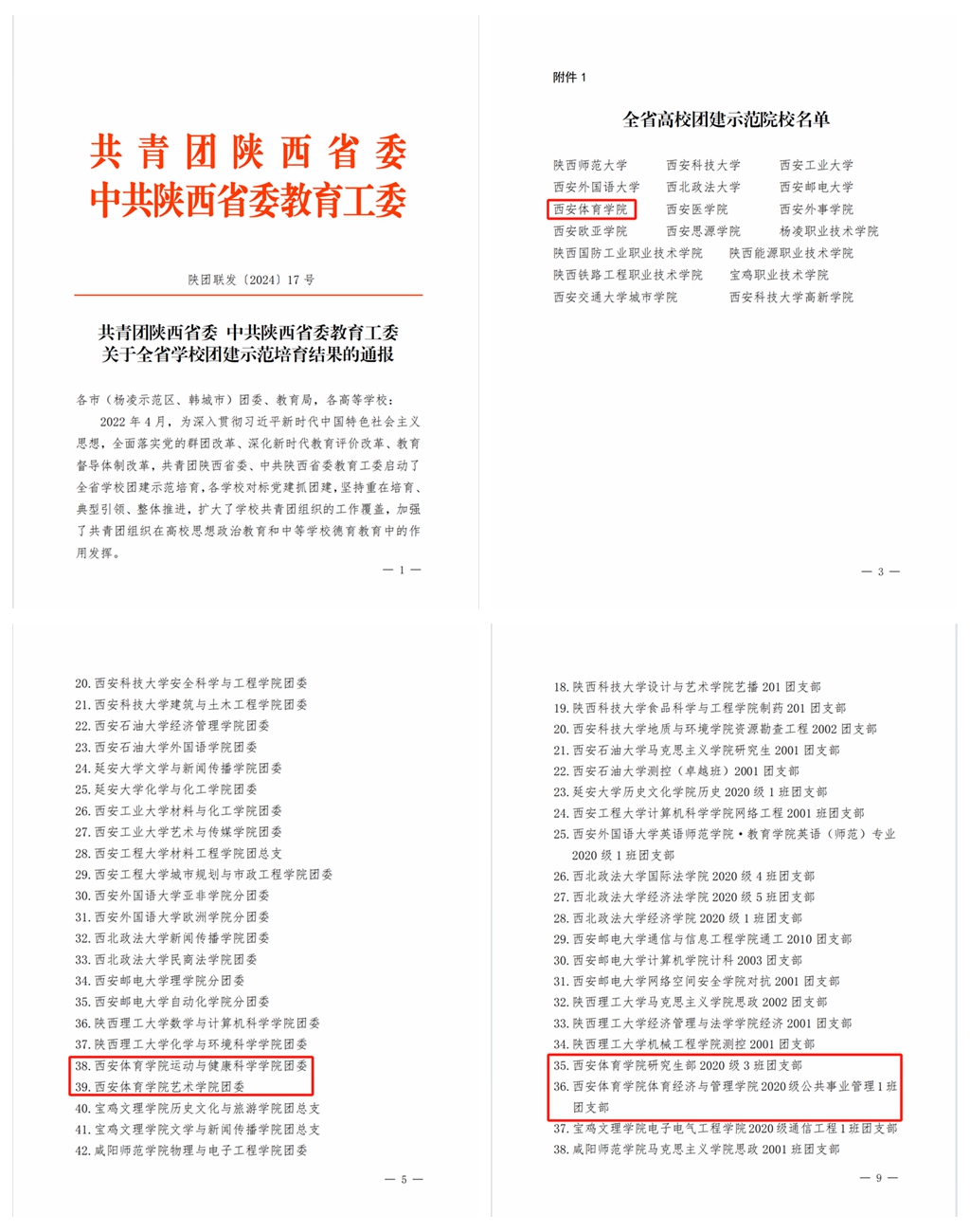 本网讯 近日,共青团陕西省委、中共陕西省委教育工委公布《关于全省首批新时代高校团建示范创建结果的通报》(陕团联发〔2024〕17号),万象城入选全省高校团建工作示范院校,运动与健康科学学院团委、艺术学院团委入选全省高校团建工作标杆院系,研究生部2020级3班团支部、体育经济与管理学院2020级公共事业管理1班团支部入选全省高校团建工作样板团支部。
