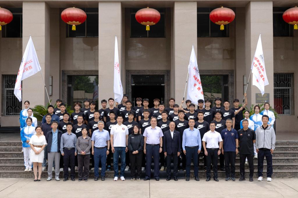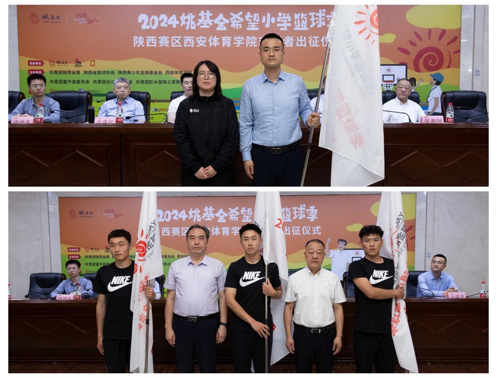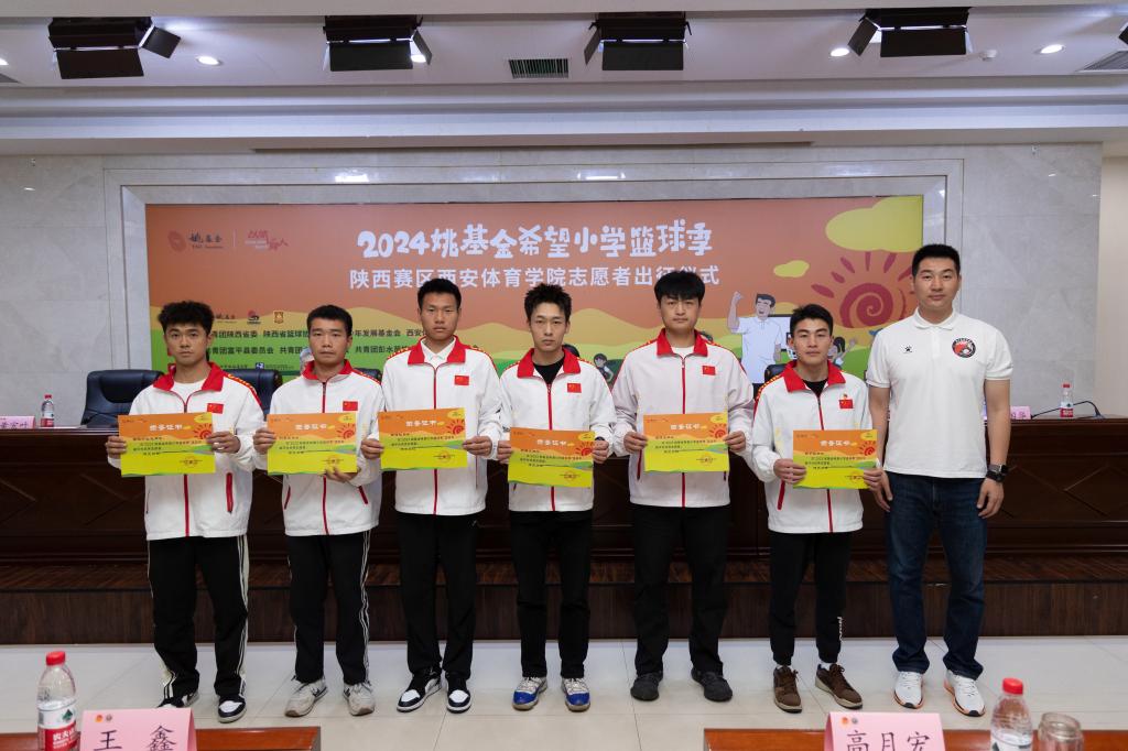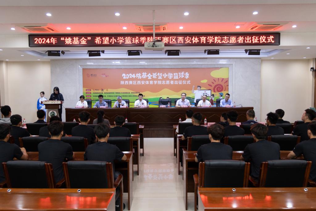 本网讯 5月8日上午,2024年“姚基金希望小学篮球季”支教志愿者出征仪式在万象城含光校区举行。北京“姚基金”公益基金会项目主管欧敏,陕西省希望工程中心主任、省青少年发展基金会理事长乌钢、陕西省小篮协秘书长杜旭,校党委委员、附属竞技体育学校校长张朝阳以及学工部、教务处、校团委等部门负责人,支教志愿者所在二级学院党委书记、团委书记、辅导员、培训教师出席出征仪式。