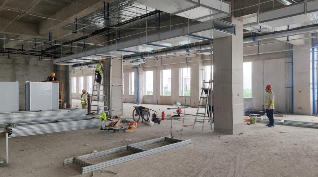 施工现场,我们采访基建处处长甘泽军,他介绍,该项目以3周为一个阶段,因为建筑工序繁多,施工标准高,要求复杂,各阶段时常叠加进行,7月1日至20日已经开启外装饰施工,8月4日已到场6千方石材,有的需要现场切割,预计8月10日完成外墙石材贴挂。目前开始的是第3阶段的安装工程,每天大约有450人投入工作,包括玻璃幕墙安装、内外三层的保温防水、楼内地砖铺贴、吊顶、空调机安装等,计划8月底完成装饰装修。“目前工程进度顺利,下一步,我们将继续铆足干劲,担当作为,抓管理、保质量、提进度,确保工程如期完工交付,确保学校如期使用,以优异成绩向建校70周年献礼!”甘泽军说。