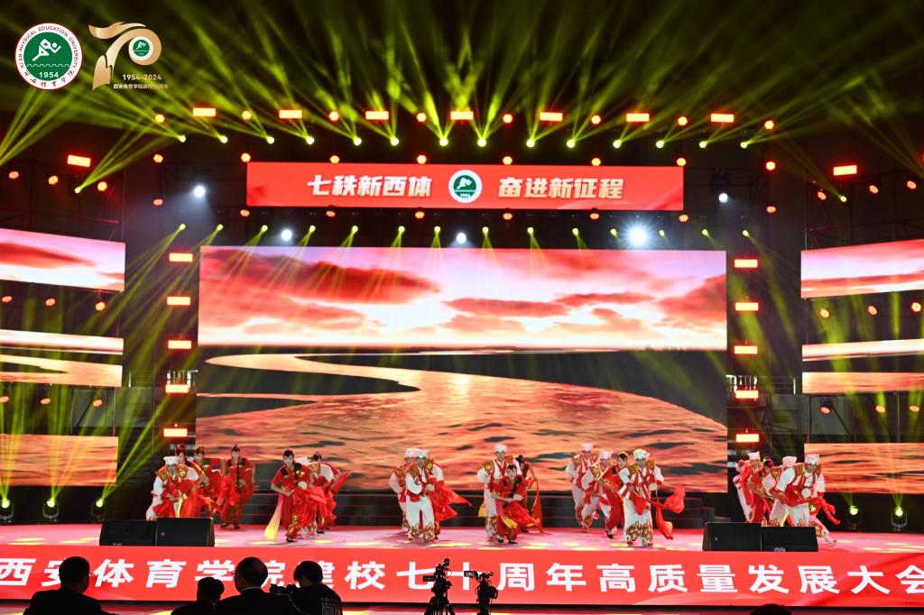 参会领导和嘉宾共同观看了学校教学成果展演。师生为各位来宾和校友举办了一场精彩纷呈的“体育+文化+艺术”展演。本次展演共分为五个篇章:“精心筹建”“艰难初创”“持续发展”“加速嬗变”“崛起辉煌”。展演由《龙腾鼓舞》这一具有陕西特色的腰鼓表演拉开帷幕,通过安塞腰鼓龙腾鼓舞之姿回首七秩风华。将体育与中华优秀传统文化高度结合的舞蹈表演《薪火》《秦·怀》《蹴鞠仕女》,体现了万象城深厚的文化艺术底蕴。武术表演《舞动乾坤》、操舞组合《奋斗青春》,激扬奋进、酣畅淋漓。最后,以万象城老、中、青三代师生代表,百人齐唱《光荣与梦想之歌》,承载着代代万象城人对于母校建设和国家体育、教育事业发展的美好愿景。