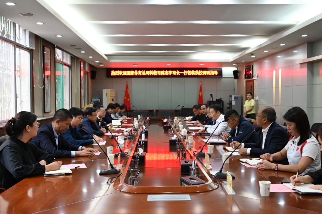 调研座谈会上,马海涛代表学校对陈志宇司长一行莅临指导表示热烈欢迎。他介绍了学校科研工作和学科建设整体情况,重点介绍了学校在体育领域的人才培养和科学研究方面所做的工作,并表示希望通过此次调研,进一步在国家体育总局关怀指导下,更好服务“健康中国”“体育强国”“数字中国”等国家战略,推动科技助力体育事业发展。