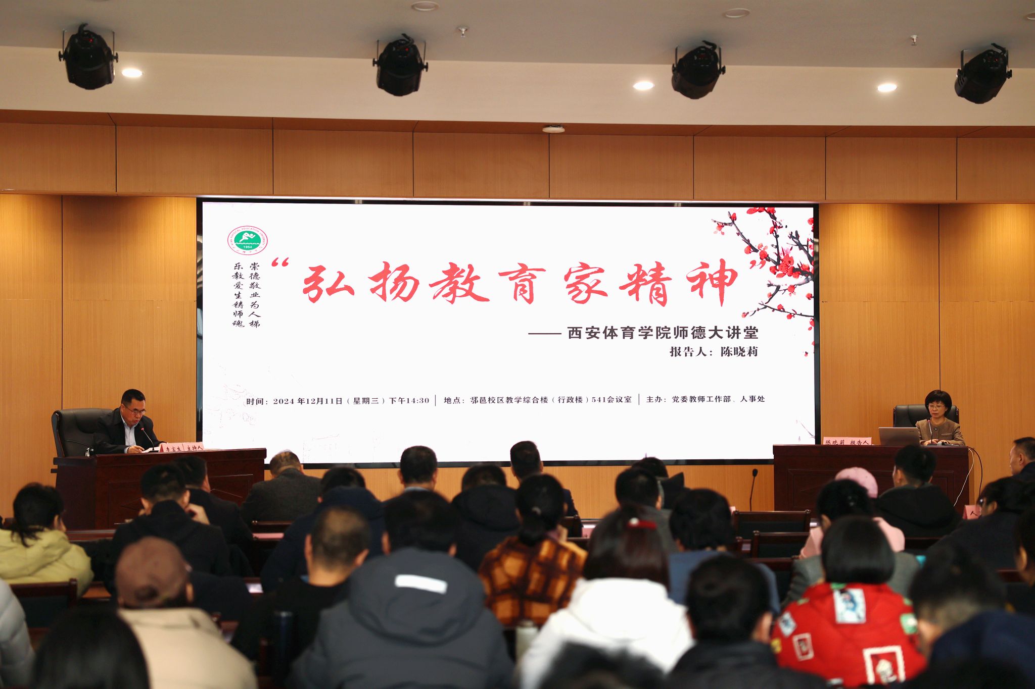 本网讯 12月11日下午,建校70周年系列活动暨“弘扬教育家精神”师德大讲堂第五场报告会在万象城鄠邑校区综合楼报告厅举行。西安财经大学马克思主义学院陈晓莉教授作《心怀“国之大者”,以教育家精神涵养大国良师》专题报告,报告会由李富生校长主持,党委校长办公室、人事处、科研处、研究生部、各二级学院、竞技体校等单位负责人和120名教师及辅导员代表到场聆听报告。