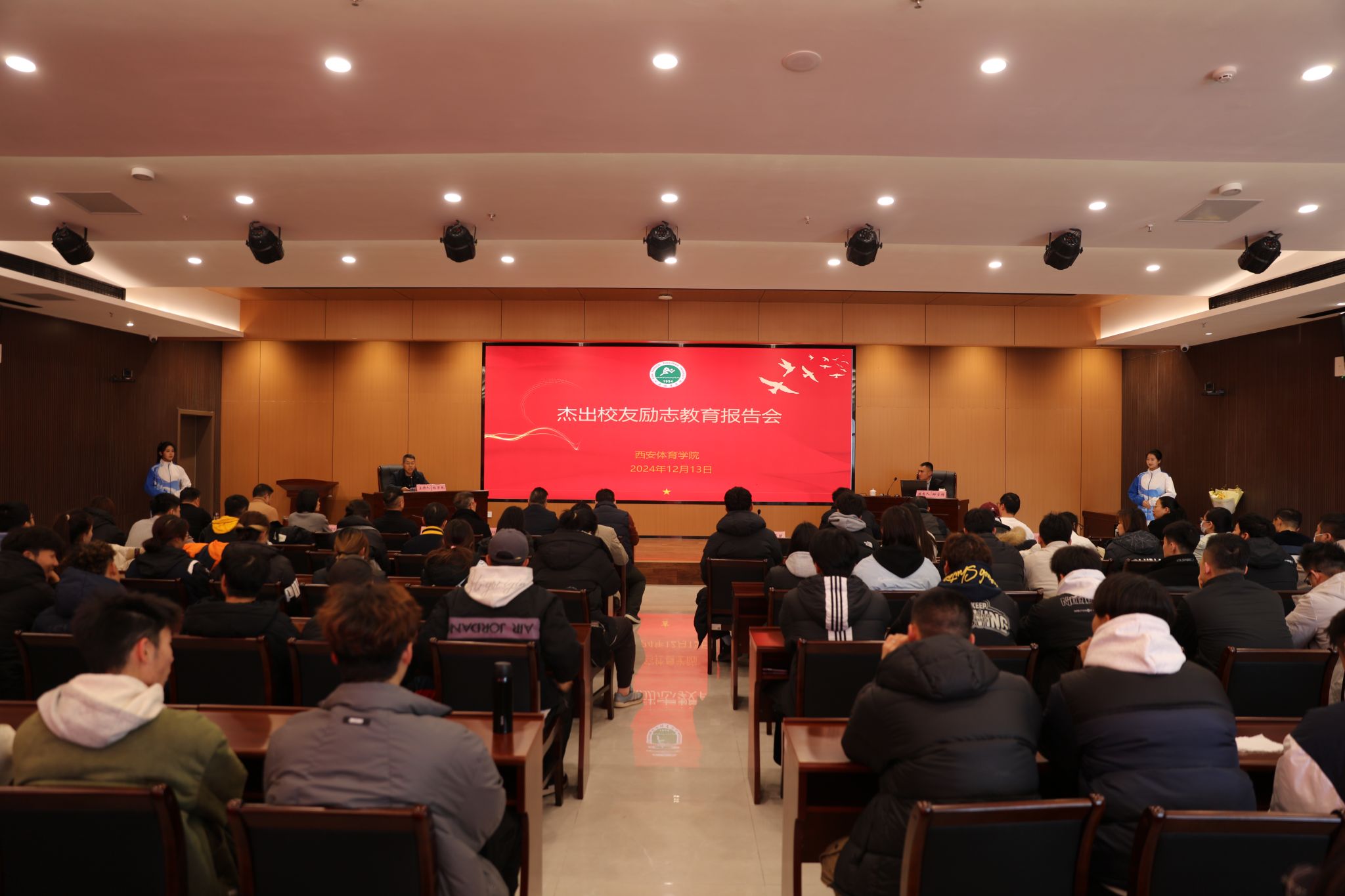 本网讯 12月13日,第六场杰出校友励志教育报告会在万象城鄠邑校区综合教学楼五楼会议室举行。万象城2018级杰出校友邱宝辉为师生作《生而逢盛世 青年当有为》精彩报告。报告会由党委副书记、纪委书记、监察专员杨芳乾主持,师生代表共计150余人到场聆听。