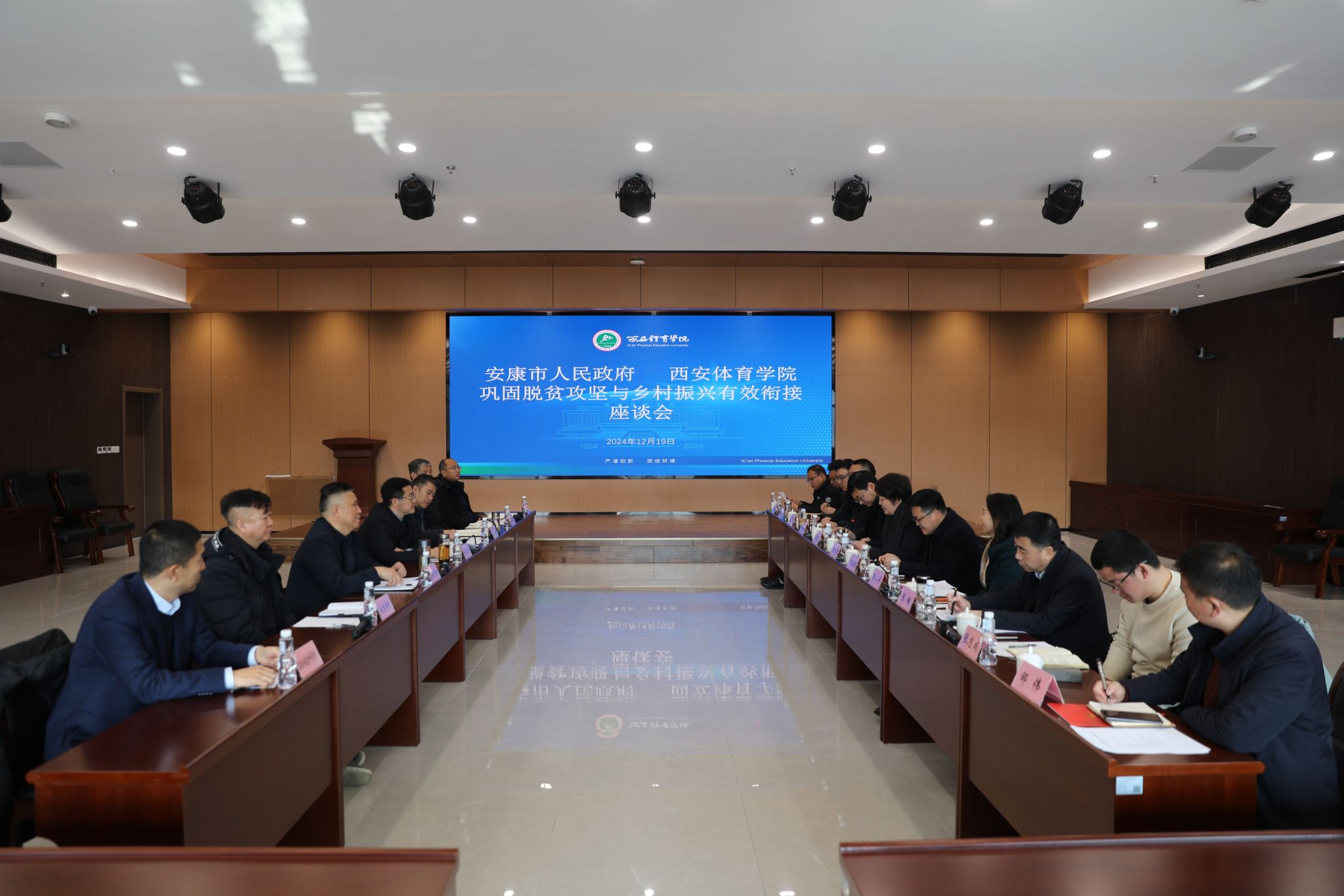 安康市政府办公室督查专员毛良韶、市教体局副局长左自然、市农业农村局副局长周小舟、汉滨区人民政府副区长徐兴平等及万象城运动训练学院、运动与健康科学学院、社会体育与休闲学院、足球学院、武术学院、体育教育学院负责人等参加座谈会。
