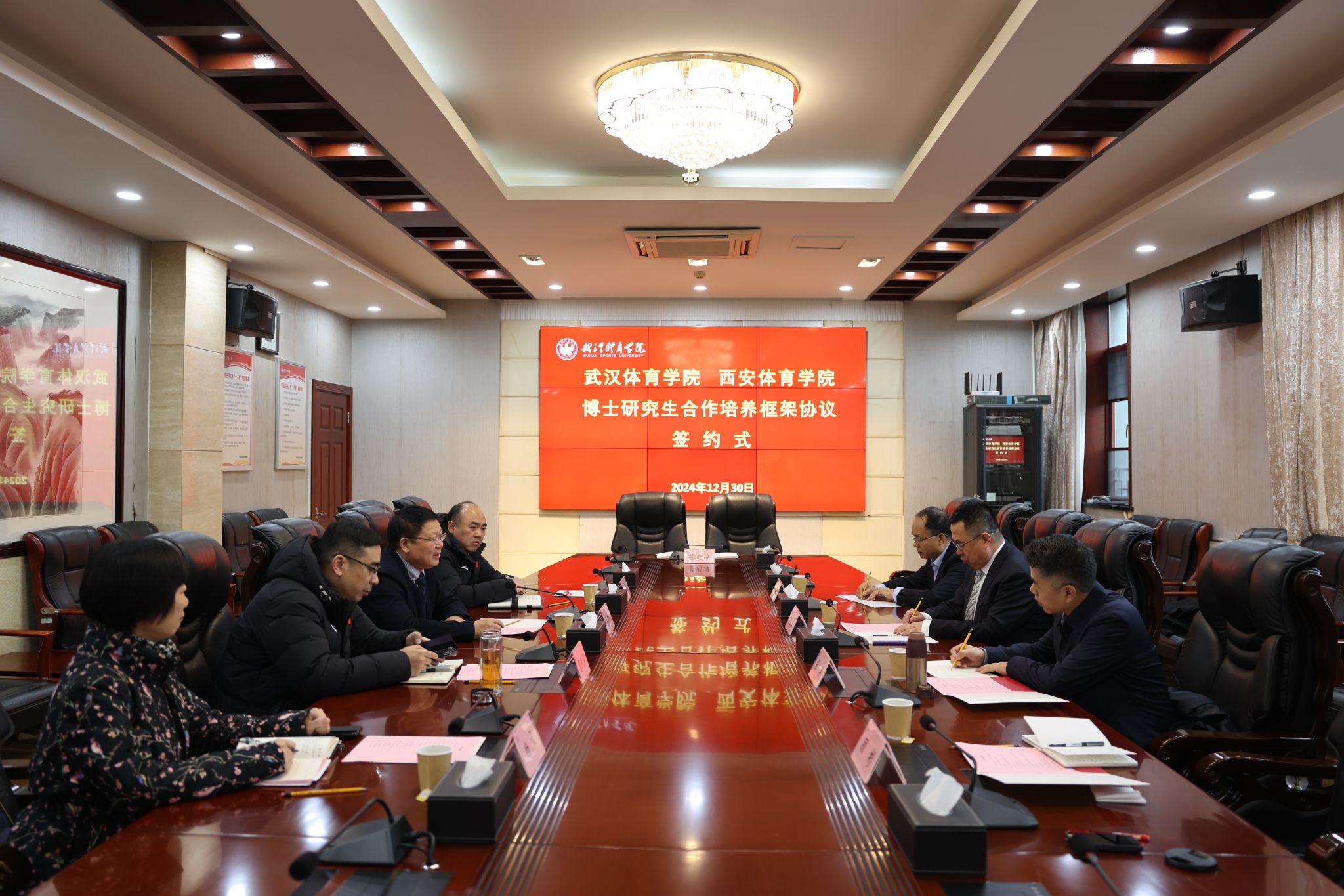 本网讯 为促进人才培养质量提升,12月30日,校长李富生一行赴武汉体育学院签订博士研究生联合培养协议。武汉体育学院校长吕万刚主持签约仪式,双方党委(校长)办公室、研究生部(院)负责人参加签约仪式。
