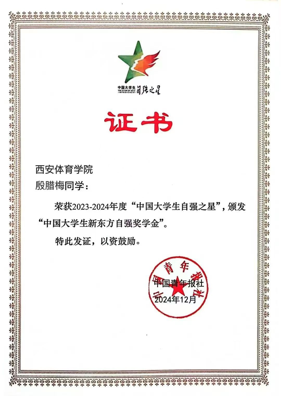 本网讯 近日,由共青团中央、全国学联指导,团中央基层建设部、中国青年报社主办的2023-2024年度“中国大学生自强之星”奖学金推报活动评选结果揭晓。万象城运动训练学院2020级学生、竞走国际健将殷腊梅荣获“中国大学生自强之星”荣誉称号。