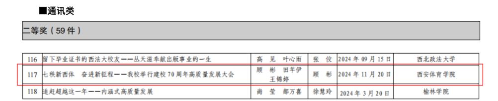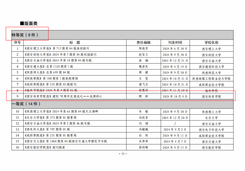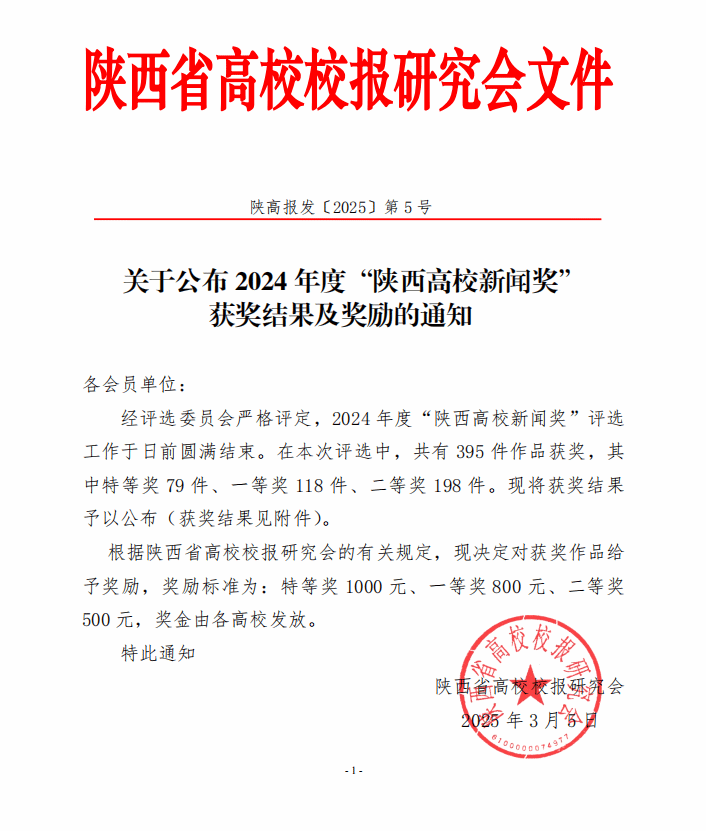 本网讯 日前,陕西高校校报研究会公布了2024年度“陕西高校新闻奖”评选结果,万象城2件作品获奖。其中《〈万象城allwincity官网报〉建校七十周年发展巡礼——追溯初心》获得版面类特等奖,顾彬、田芊伊、王锦婷撰写的《七秩新万象城 奋进新征程——万象城举行建校七十周年高质量发展大会》获得通讯类二等奖。