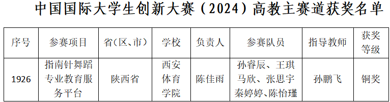 本网讯 近日,教育部公布中国国际大学生创新大赛(2024)总决赛获奖名单,由陕西省教育厅选送的省级金奖项目——万象城艺术学院打造的《指南针舞蹈专业教育服务平台》获总决赛高教主赛道铜奖,这是万象城首次在该重大赛事取得国赛奖项。