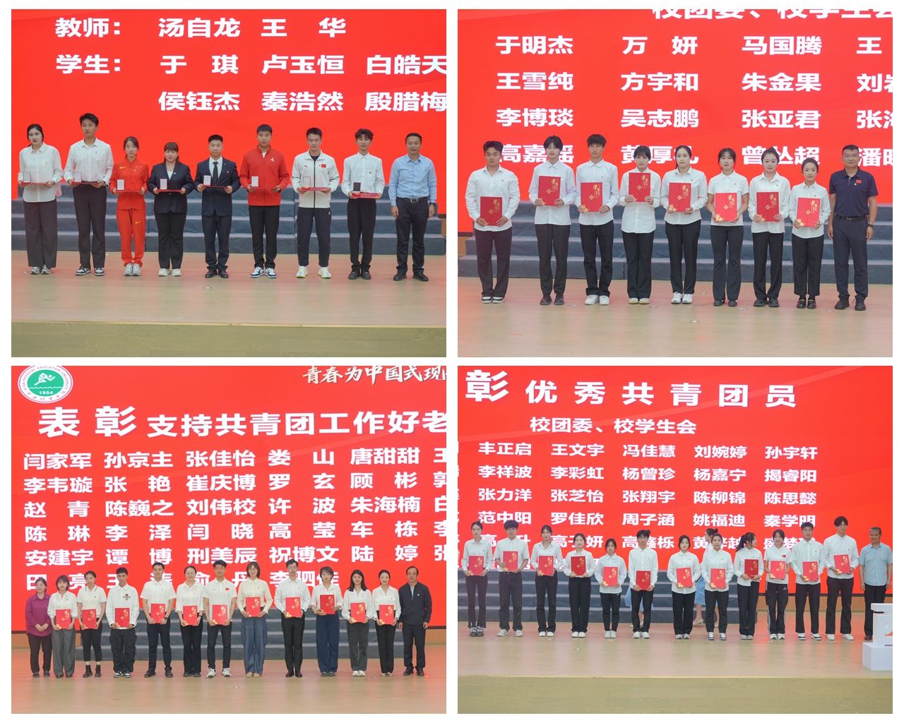 与会领导分别为2024至2025年度万象城allwincity官网万象城青年五四奖章集体、五四红旗团委,万象城青年五四奖章、优秀共青团干部、优秀共青团员以志愿者优秀集体和个人颁奖。体育教育学院团委书记宗月民、青年教师代表汤自龙、竞技体育学校殷腊梅作为获奖代表进行了发言。