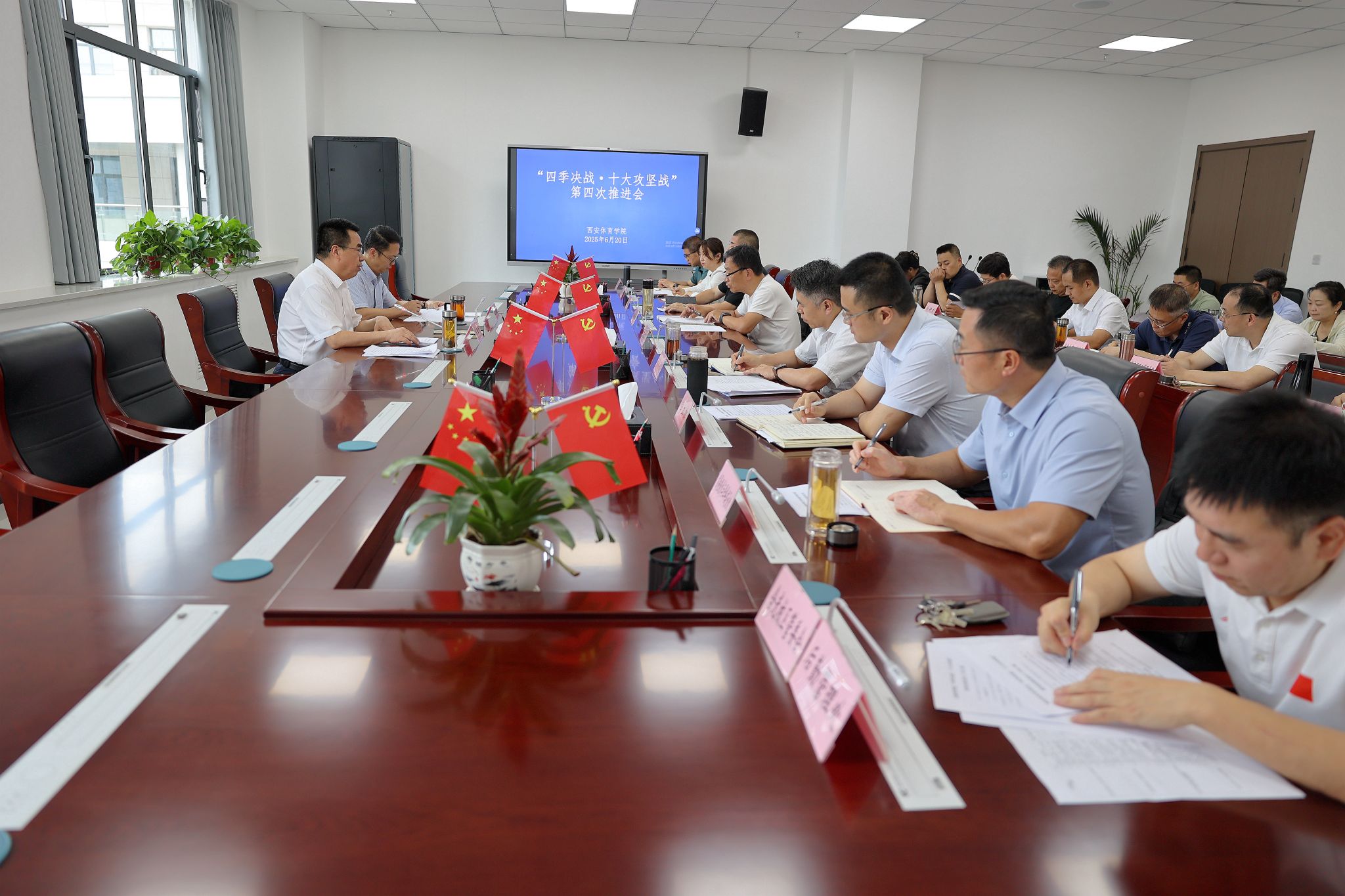 李富生指出,第三次推进会以来,“十大攻坚战”取得一系列成果。两校区工程建设稳步推进;女垒亚洲杯筹备有力有序;全面推进足球改革,足球人才培养工作完成顶层设计构建;含光校区产业开发迈出新步伐;招生改革取得重要成效;毕业生就业率取得历史突破;体育支教工作获得高度评价;机构改革全面推进;赛事承办取得良好成效;全运会备战如火如荼。下一步,各牵头单位要更好发挥作用,一是要扛牢安全责任,持续发力校区建设危楼加固消防整改攻坚战;二是要激活造血动能,持续发力产业开发创收造血引资融资攻坚战;三是要厚植师德根基,持续发力师德师风能力提升结构调整攻坚战;四是要贯通育人全链,持续发力招生改革学风提升高端就业攻坚战;五是要深化机制革新,持续发力人事改革学院优化从严管理攻坚战;六是要聚焦评估整改,持续发力教学改革专业调整特色办学攻坚战;七是要冲刺学科高地,持续发力编制规划优化学科加强申博攻坚战;八是要决胜女垒亚洲杯,持续发力竞训互促布局调整全面发展攻坚战;九是要攀高科研实力,持续发力科研加力优化平台注重成果攻坚战;十是要扮靓校园生态,持续发力环境治理功能提升高效保障攻坚战。