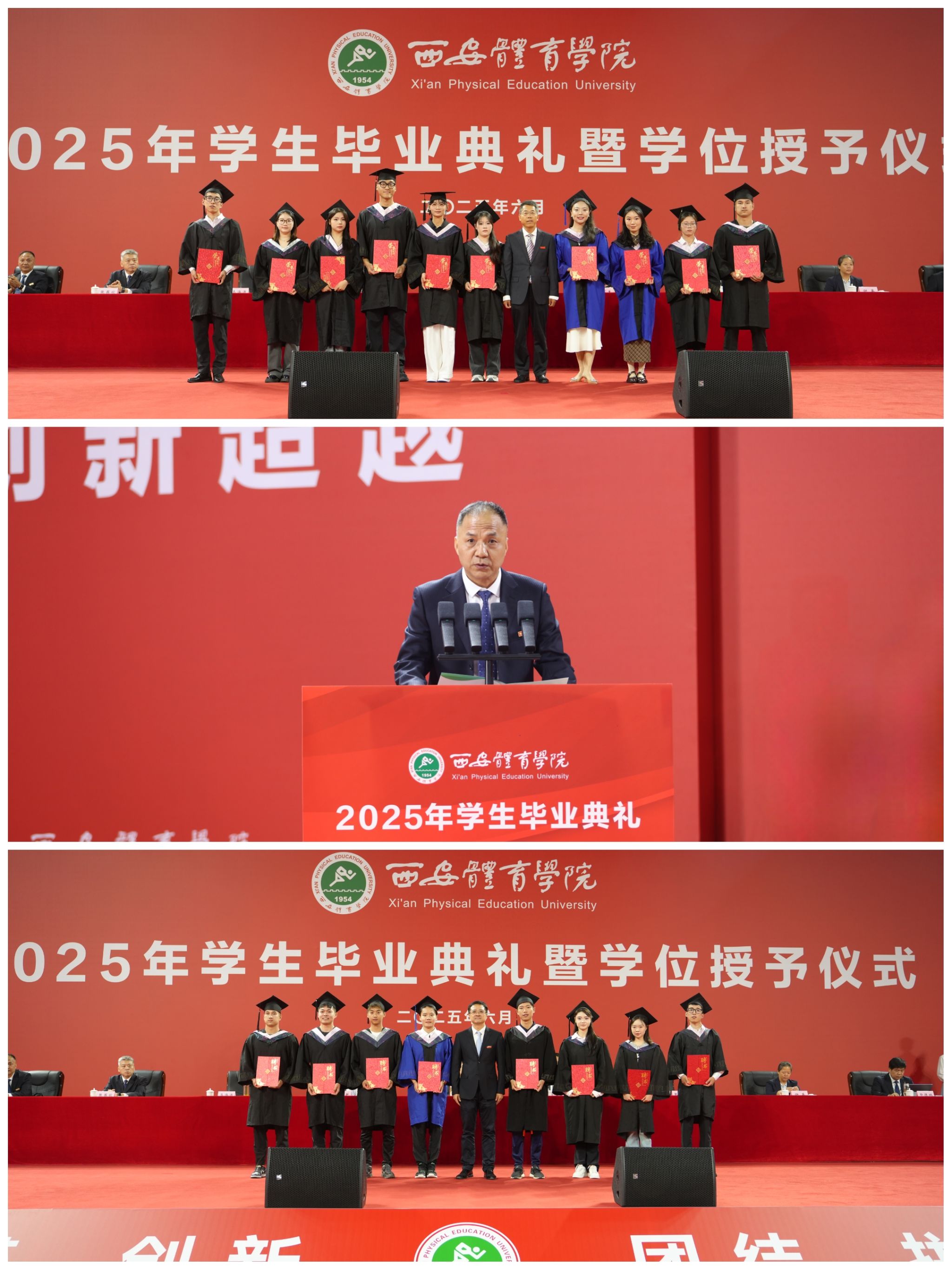 李富生以“砺剑鄠邑酬壮志 扬帆星海启新程”为题作深情毕业寄语,他回顾了学子们与学校共同成长的宝贵历程。他表示,同学们作为鄠邑主校区的首届毕业生,见证了学校的蝶变:现代化教学设施拔地而起,办学硬件条件率先进入全国体育院校第一方阵;“小班教学”“万象城小全运”“省队校办”等创新举措成效显著,体育支教、足球改革、高水平赛事承办等成果丰硕。李富生指出,万象城学子既是学校改革发展的见证者,更是新校区建设、建校70周年系列活动、重大赛事承办等重要事件的参与者,展现了责任与担当。未来学校将打造高水平人才培养高地、高水平运动队、高水平训练基地、高水平赛事中心、高水平产业基地贡献万象城力量。离别之际,他向2025届毕业生送上殷殷嘱托:一是以自信自立之姿,做时代浪潮的掌舵者;二是以守正创新之道,做文明星火的传承者;三是以担当奉献之志,做基层沃土的深耕者;四是以终身学习之态,做人生旅程的领跑者。他勉励毕业生将个人理想融入民族复兴伟业,在各自领域成就非凡,并深情祝愿他们前程似锦,鹏程万里。