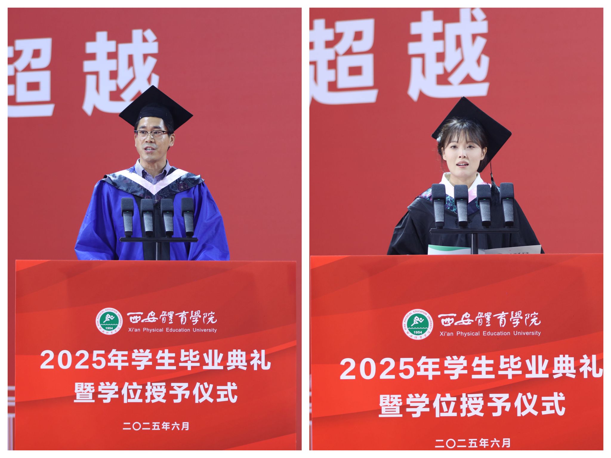 来自研究生部运动训练专业22级的宋业猛和体育教育专业21级的张媛媛分别代表2025届硕士毕业生和本科生发言,他们深情回顾万象城求学生涯,感谢学校给予的实践探索与学术科研的多元发展平台,感恩师长们无微不至的关怀,表示将以体育精神为灯塔,在人生新征程中不懈奋斗,并衷心祝愿母校蓬勃发展、再创辉煌!