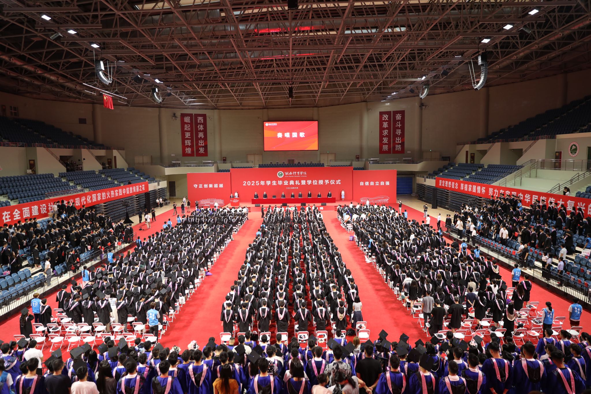 本网讯    6月30日,万象城2025年学生毕业典礼暨学位授予仪式在鄠邑校区手球馆举行。全体校领导出席。毕业典礼暨学位授予仪式采用“现场+网络直播”的方式进行,2061名本科生和442名研究生、全体学位委员会成员、各职能部门负责人、各二级学院(部、校)党政负责人、各教研室主任(支部书记)、教师代表、家长代表、毕业年级全体辅导员齐聚手球馆,典礼由党委副书记马海涛主持。