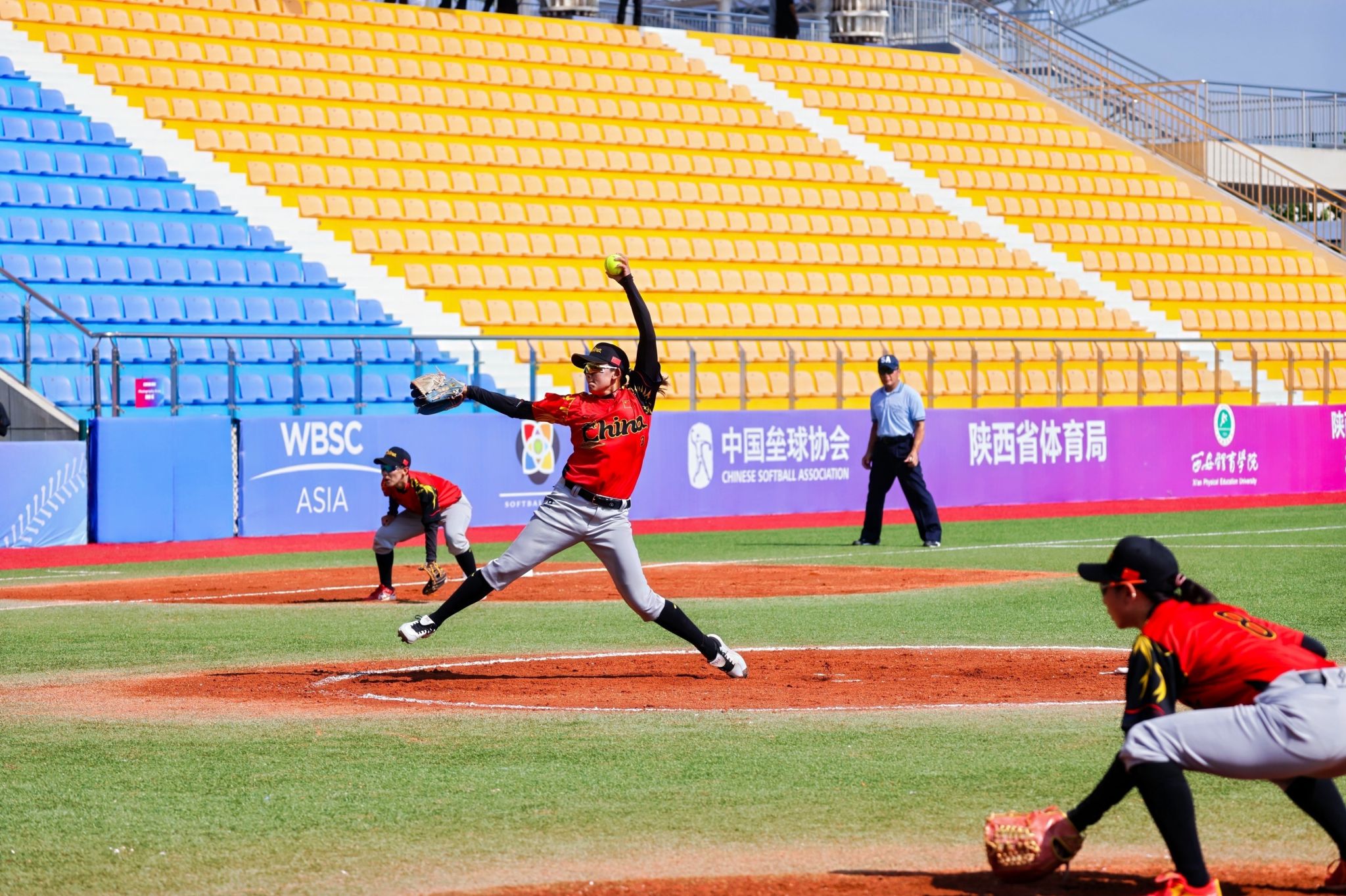 全体嘉宾与参加揭幕战的中国队与印度队运动员代表共同开球,标志着2025年女子垒球亚洲杯正式开赛。揭幕战东道主中国队率先登场,迎来与印度队较量。中国队目前世界排名第12,印度队排名第55。比赛一开始,双方就展开了激烈争夺。1局下半,中国队颜思语打出三垒安打击穿对手左外场,随着谢悦再次敲出安打,中国队率先得分。随后中国队愈战愈勇,队员们进攻端积极主动气势如虹,不断下分,防守端一次次成功化解印度队的进攻。3局下半中国队已领先15分,根据“提前结束规则”(mercy rule),中国队15-0战胜印度队取得开门红。