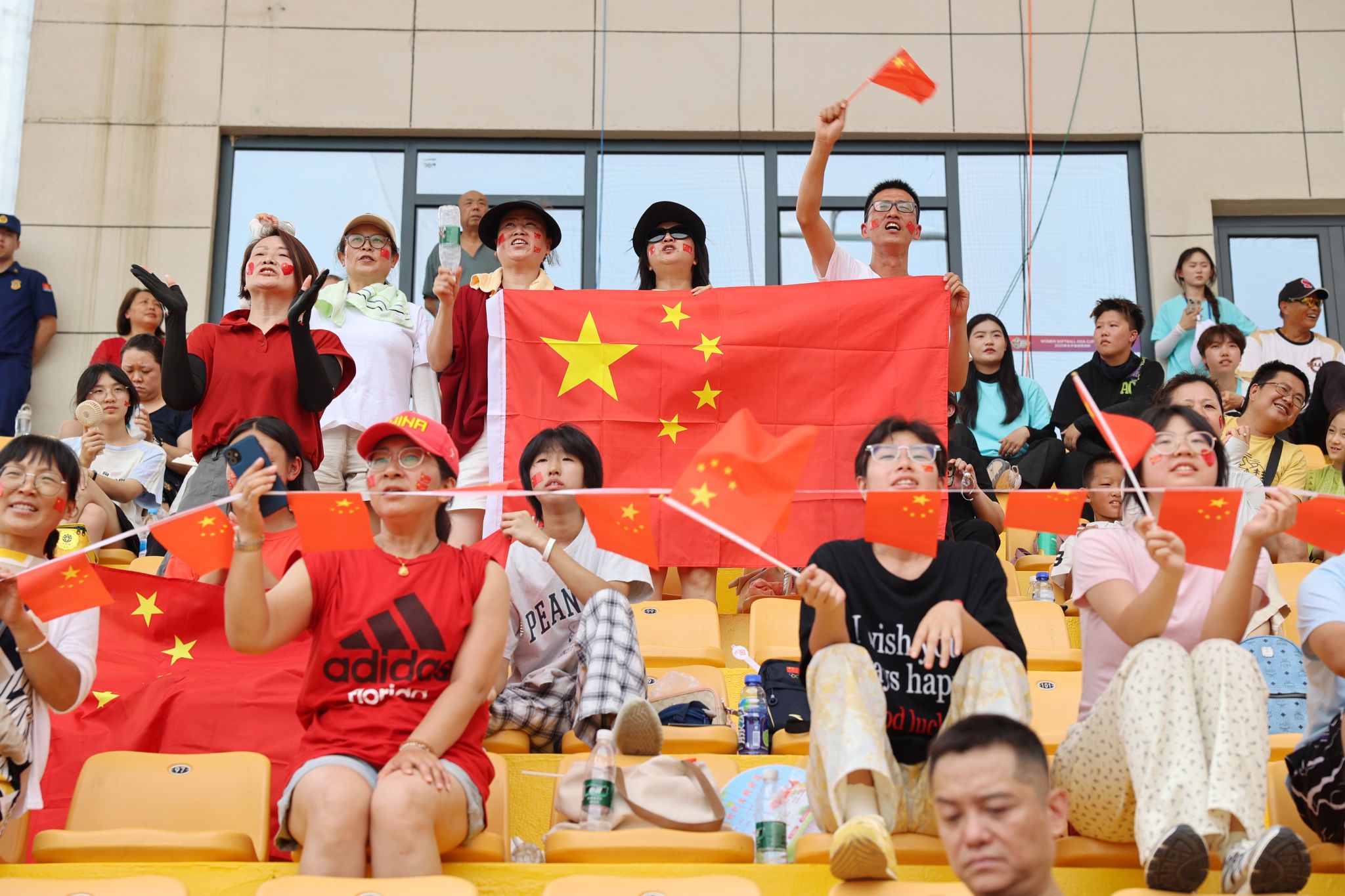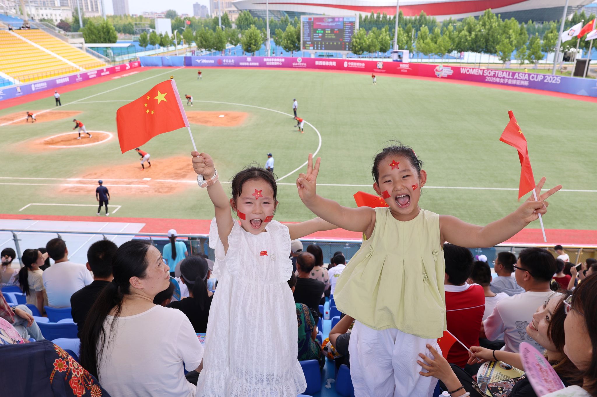 看台上,球迷的呐喊与挥舞的国旗交织成一片红色的海洋。每一次精彩的得分,都能看到看台上那面格外醒目的五星红旗——那是中国女子垒球队柴燚楠、李嘉麒和奚凯琳的母亲们,她们从兰州、辽宁、无锡千里奔赴,只为在女儿每一次挥棒时呐喊助威,见证女儿在赛场上的英姿。鄠邑本地的球迷王先生激动地说:“在家门口就能看到这样的洲际赛事,太自豪了!希望中国队能继续提高比赛和实战经验,在明天的比赛中发挥得更加出色。”他与三位队员的母亲因比赛结缘,此刻成了最默契的战友,相约共同为中国队呐喊加油。
