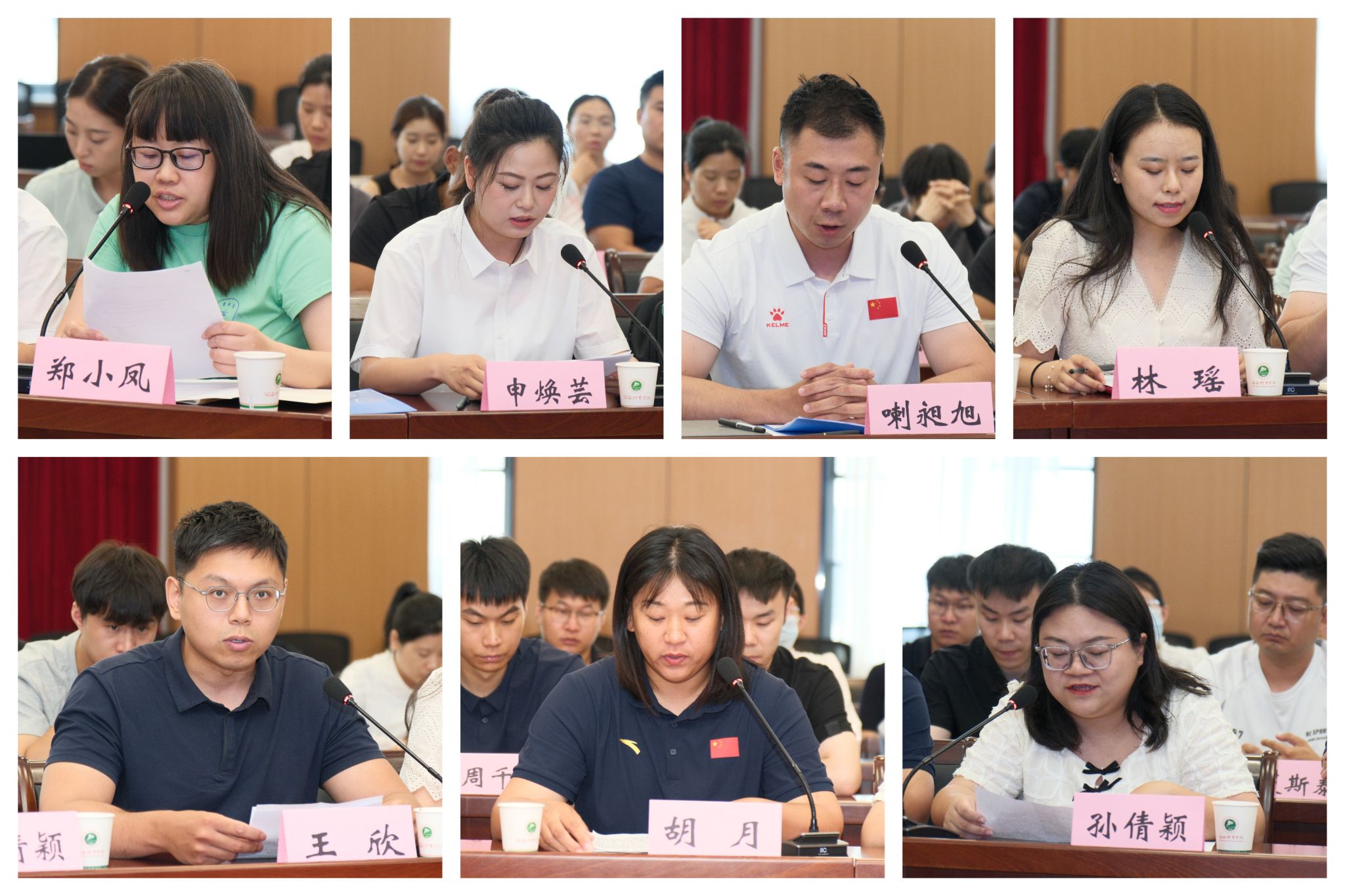 人事处汇报了师资队伍建设和新入职教职工情况。新进教师代表依次发言,他们结合自身实际,分享了在教学、科研、竞训等方面的收获和体会,也为学校未来的发展建言献策。职能部门和二级学院负责人从对新入职教职工的培养和期待以及支持举措进行了发言。