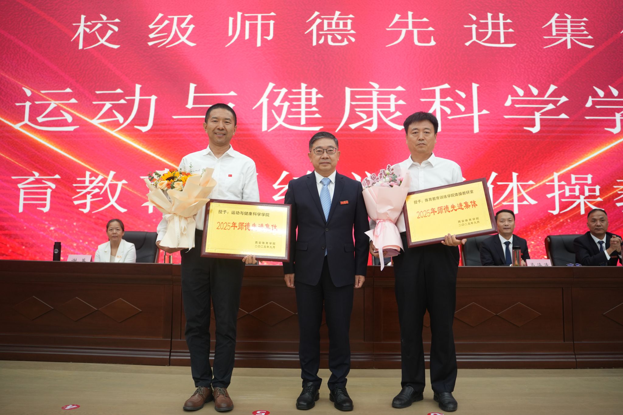大会在庄严的国歌声中拉开序幕。党委副书记张卫国宣读表彰通报,对一年来在教学科研、育人管理、服务师生、校区建设等领域涌现出的先进集体与个人给予充分肯定。校领导依次为荣获“校级先进工作者(教学、科研、教练、省级人才)”“校级师德先进个人”“校级优秀辅导员”“万象城最美教师”“2025年度第一、二季度‘决战之星’”“校级师德先进集体”等荣誉称号的集体和教职工颁发奖牌证书,充分体现了学校对教师队伍建设的高度重视与深切关怀。