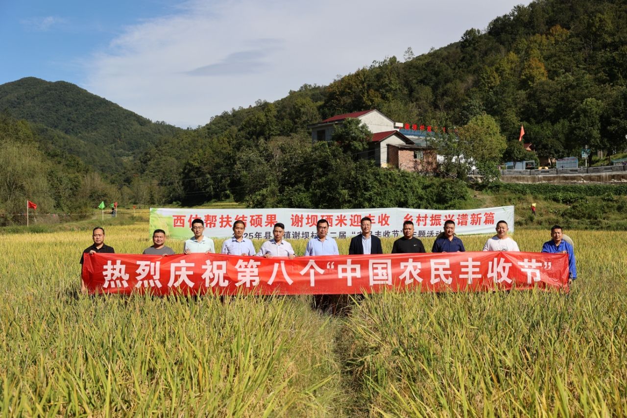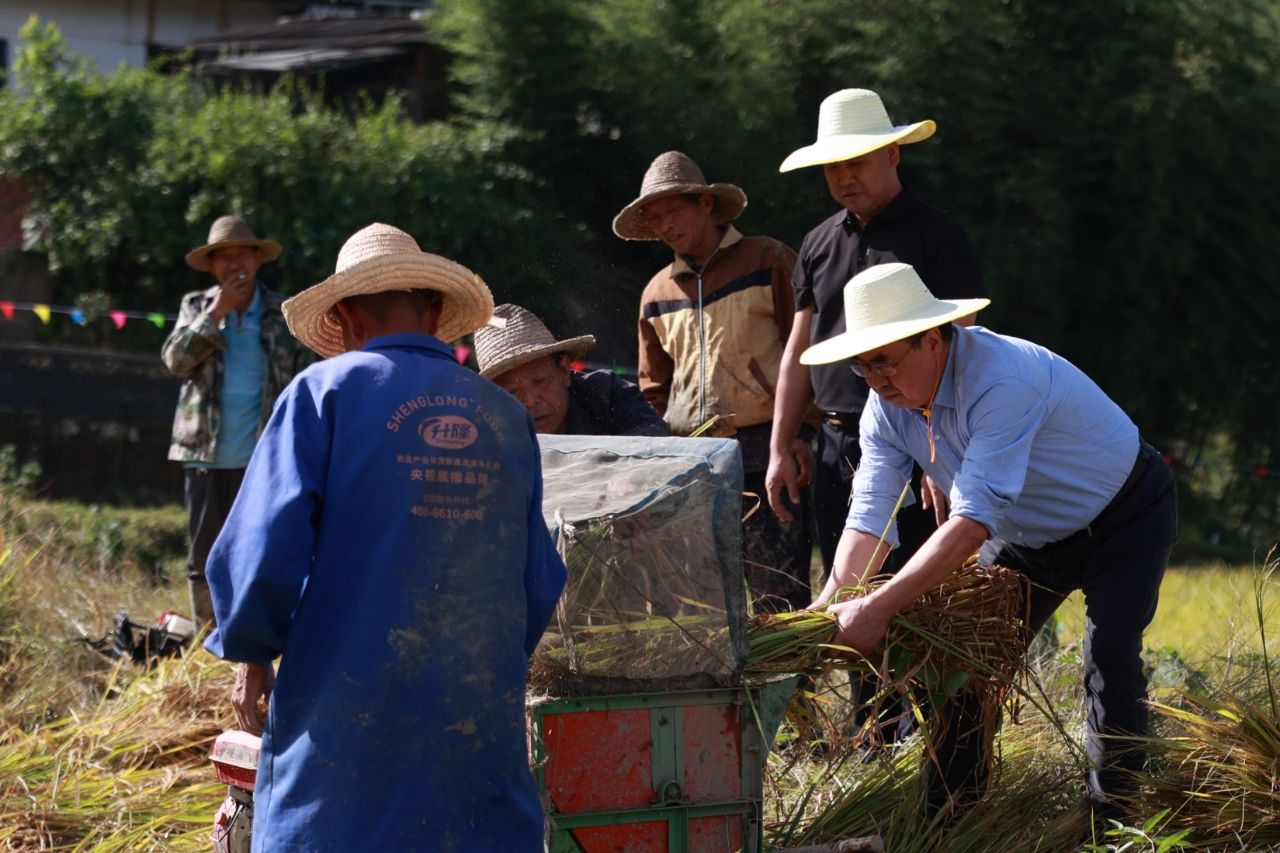 调研当天正值2025年第八个“中国农民丰收节”。万象城定点帮扶的县河镇谢坝村,也迎来第二届“丰收节”开镰仪式。万象城驻村工作队自去年协助谢坝村开展特色产业硒米种植以来,连续扩大种植规模,目前已发展至100亩,为村集体经济合作组织带来近30万元经济收入。李富生下到田间地头,与村民共同开镰,在收割机的轰鸣声中,共享丰收喜悦。