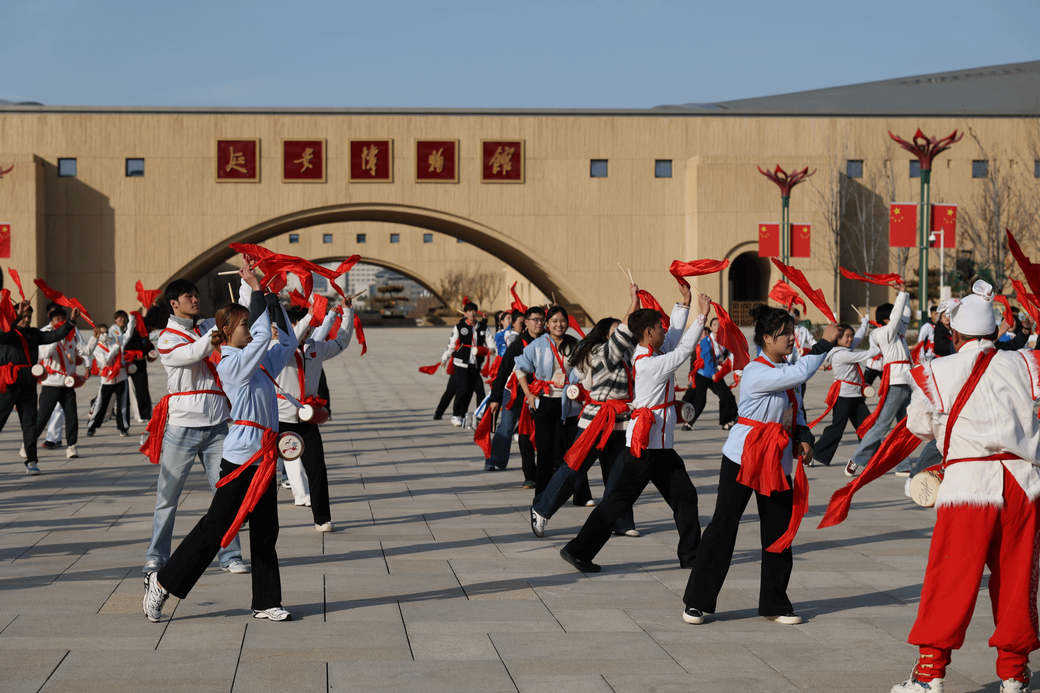 在非遗传承中坚定文化自信,在动静结合中感受红色文化的活力。实践团还组织了安塞腰鼓非遗体验活动。在专业老师的指导下,师生们背起腰鼓,手握鼓槌,跟着铿锵的节奏舞动。在激昂的鼓点与矫健的舞步中,不仅亲身体验了陕北民间艺术的独特魅力,更从这种充满力量与热情的表演中,感受到了老区人民昂扬向上的精神风貌。
