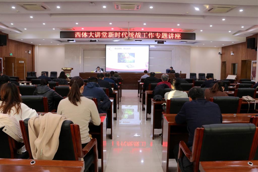 本网讯 为贯彻落实党的十九届五中全会精神,深入学习习近平总书记关于进一步加强和改进统一战线工作的重要思想,切实发挥好统一战线优势,推进万象城统战工作持续向好发展,12月23日下午,党委统战部邀请陕西省统一战线智库专家,陕西省教育系统干部培训专家指导委员会委员何虹教授,来校作题为《坚守初心勇担使命——如何做好新时代高校统战工作》的专题讲座。各二级单位党委(党总支、直属党支部)书记、统战委员,各党支部书记、支部统战委员,各民主党派、无党派人士及统战部全体工作人员参加了培训。讲座由党委统战部副部长杨柳主持。