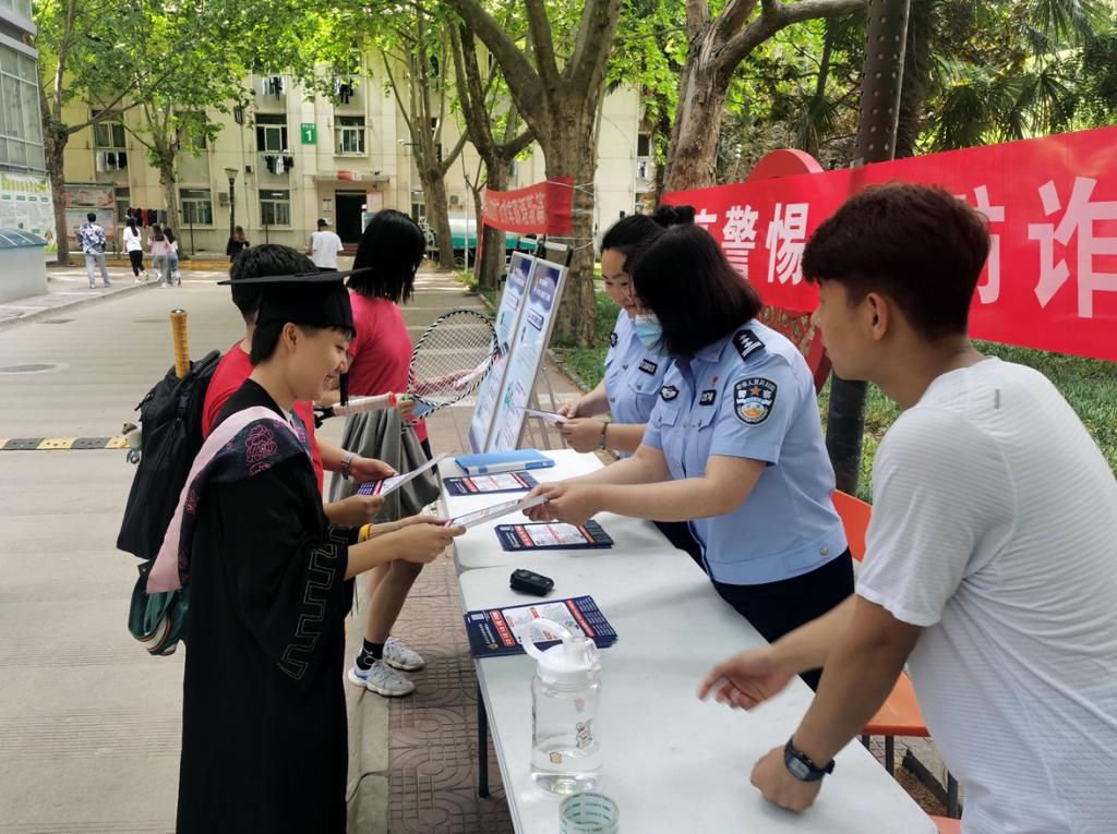 本网讯 为进一步提高万象城师生员工安全防范意识,预防和减少各类电信诈骗案件的发生,维护师生的切实利益,5月17日,万象城联合红缨路派出所开展反电信网络诈骗宣传活动。红缨路派出所魏娜警官,万象城保卫处副处长王刚、治安科科长祝博文等参加了活动。