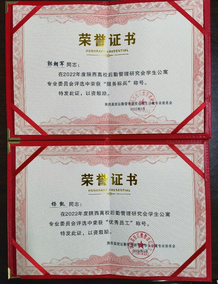 会议对2021年全省后勤各线工作进行了总结,并对表现优秀的集体和个人进行了表彰。万象城后勤管理处(集团)学生公寓管理中心因各项工作组织管理到位,成绩突出,被评为陕西省后勤管理“2021年度学生公寓管理先进集体”。中心主任郭朝军被评为“2021年度学生公寓管理服务标兵”,中心副主任杨凯被评为“2021年度学生公寓管理优秀员工”。