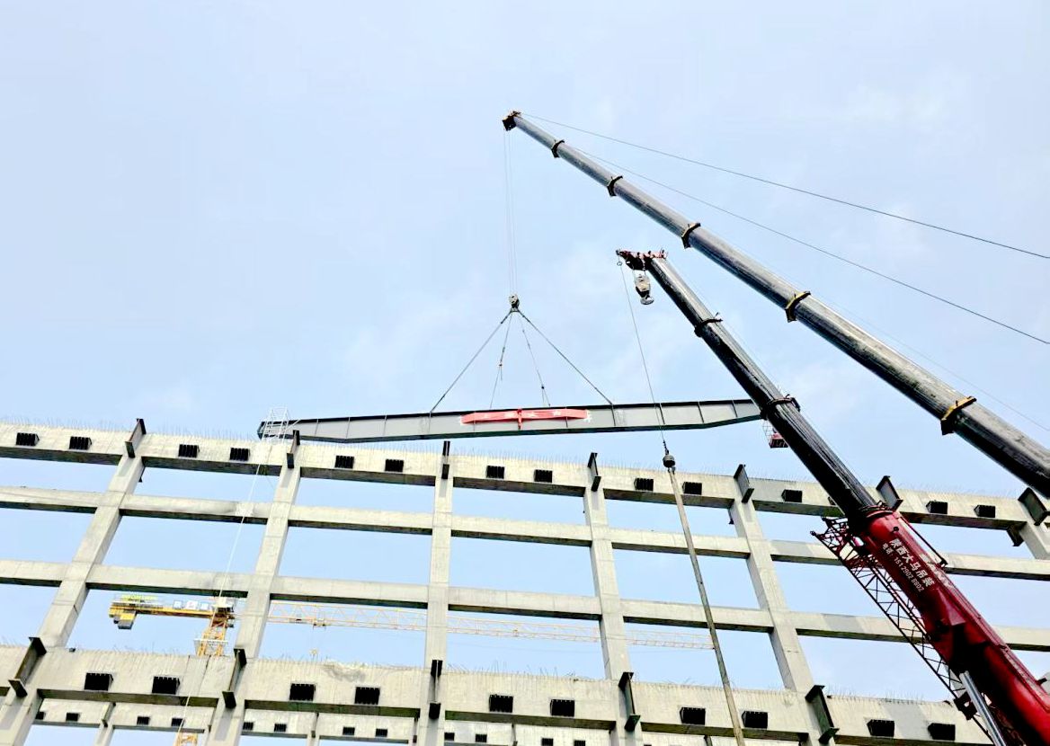 3月7日上午12时许,巨大的钢梁在起重机的牵引下缓缓升起,经过精准调整后稳稳落在预定位置,整个吊装过程一气呵成。