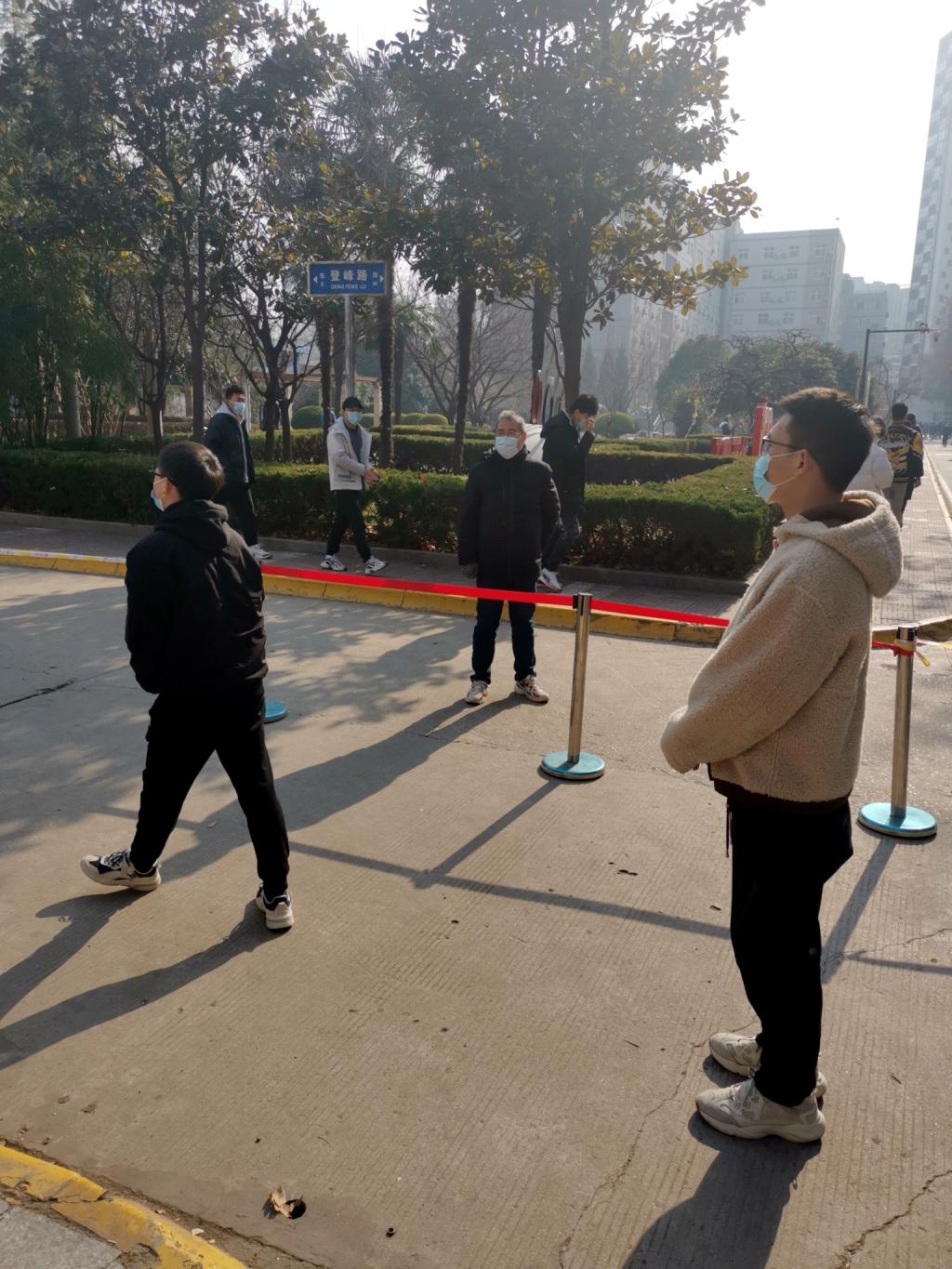 在协助武保处和二级学院做好核酸检测队伍秩序维护过程中,大家细心观察口罩未按规范佩戴的、路途中前后交谈的、未保持安全距离的学生,同志们不时提醒叮嘱。尤其在田径场与奥林匹克花园路段交叉处,大家还不停对来往垃圾倒运车和防疫车进行指挥,确保核酸检测队伍安全有序通过。