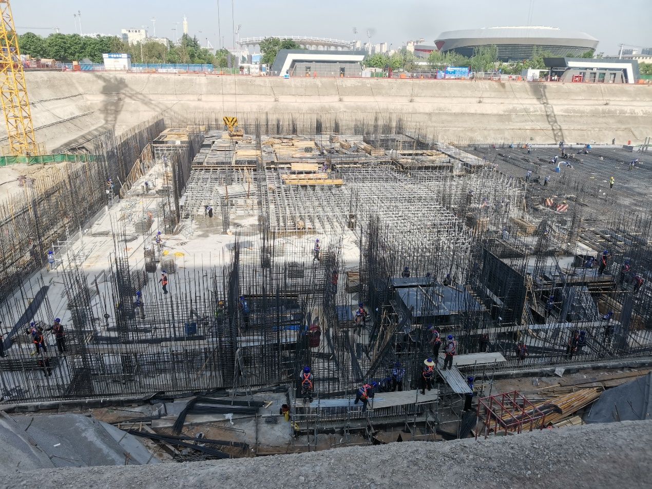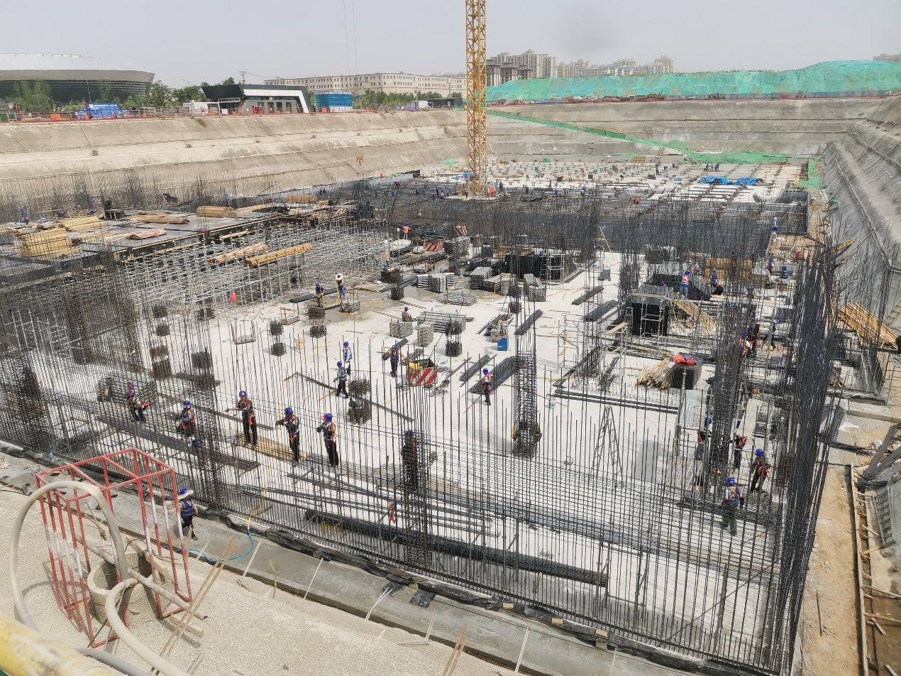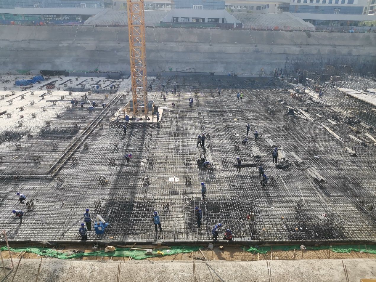 中段基础筏板施工进展顺利,底筋直螺纹套筒连接与绑扎完成95%,面筋直螺纹套筒连接与绑扎完成80%,即将完成钢筋铺设工序,为后续混凝土浇筑奠定坚实基础。
