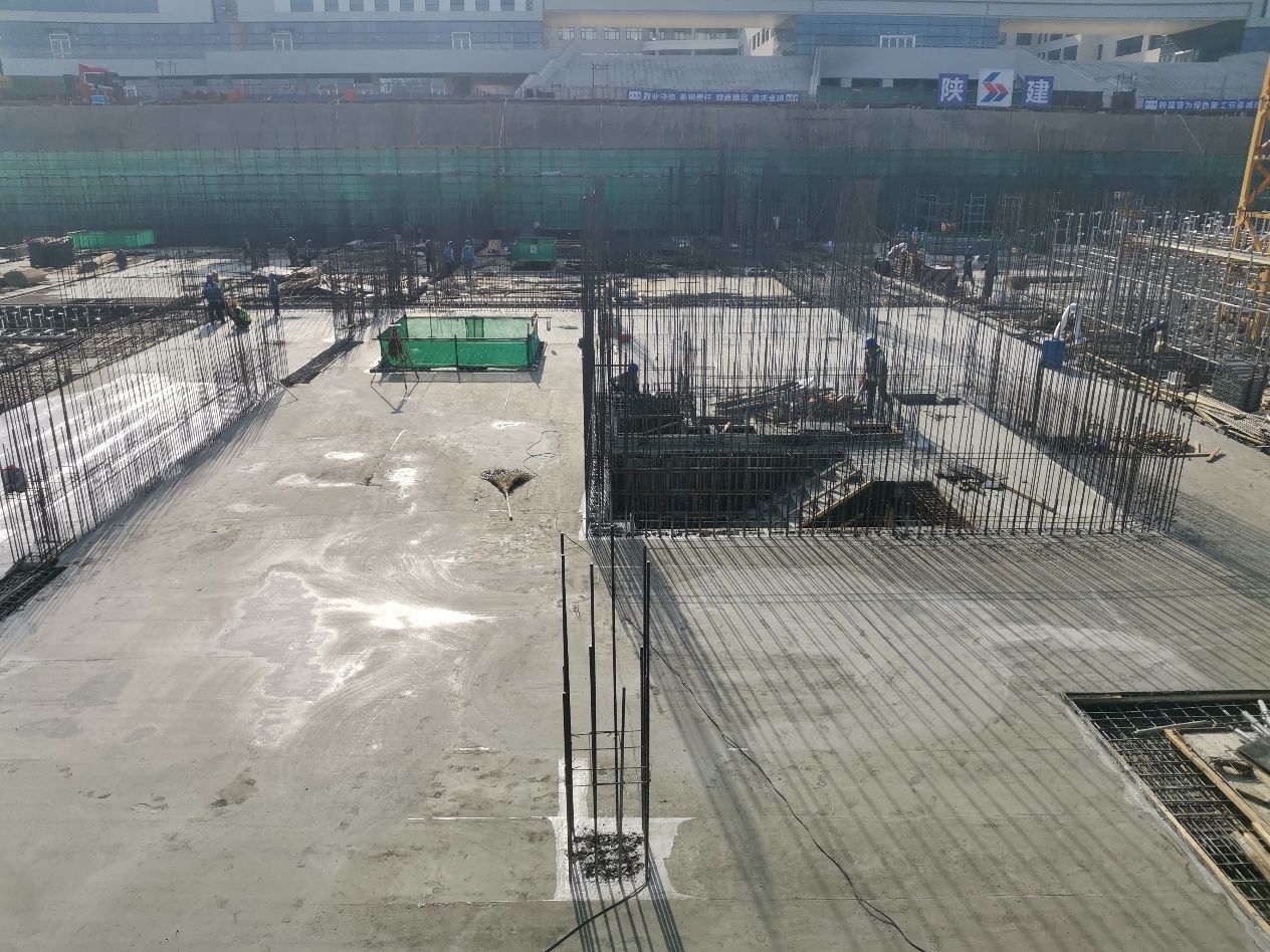 中段施工区域负二层钢筋工程接近收尾,已开始模板支设作业,处于高速施工阶段。