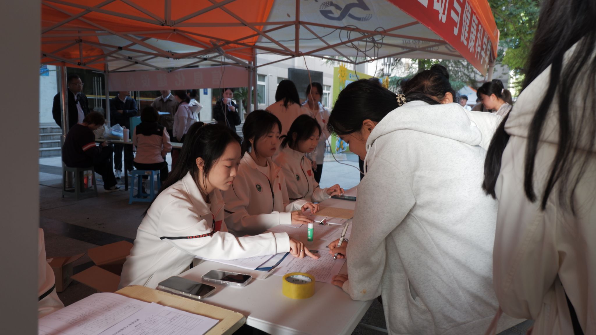 热情洋溢的学长学姐志愿者们早早步入岗位,在新生到来以后有条不紊的让大家扫脸签到,报到填表,领军训服等。并积极回答新生有关学校的各个的问题,使新生报到工作紧锣密鼓的按序进行。