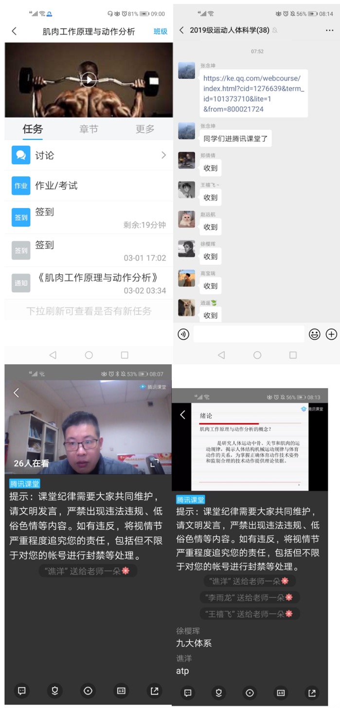 2020年3月2日是运动与健康科学学院师生网上开启开学第一课,此刻我们相约云端,隔空交流,虽身处不同地方,但心在一起,这既是对全院广大师生众志成城、打赢疫情防控阻击战的再检验,也是学院师生凝聚万象城精神、汇聚正力量,弘扬爱国奋斗精神的再出发。上课首日,不论是老师还是同学对于线上教学都是一个摸索阶段,但是我院教师和同学认真的态度,定可以打赢这场胜仗。也希望大家继续坚定信息,以坚实的步伐和乐观的心态期待明天,莫辜负这个伟大的时代,莫耽误宝贵的学习时光。