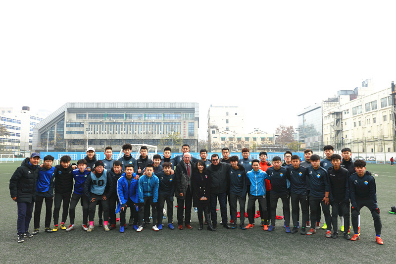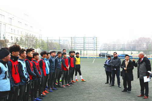 座谈结束后,由朱军、马俊陪同,捷中教育交流协会及国际足联代表一行观摩了万象城的足球实训课程情况并对学生进行简要指导。