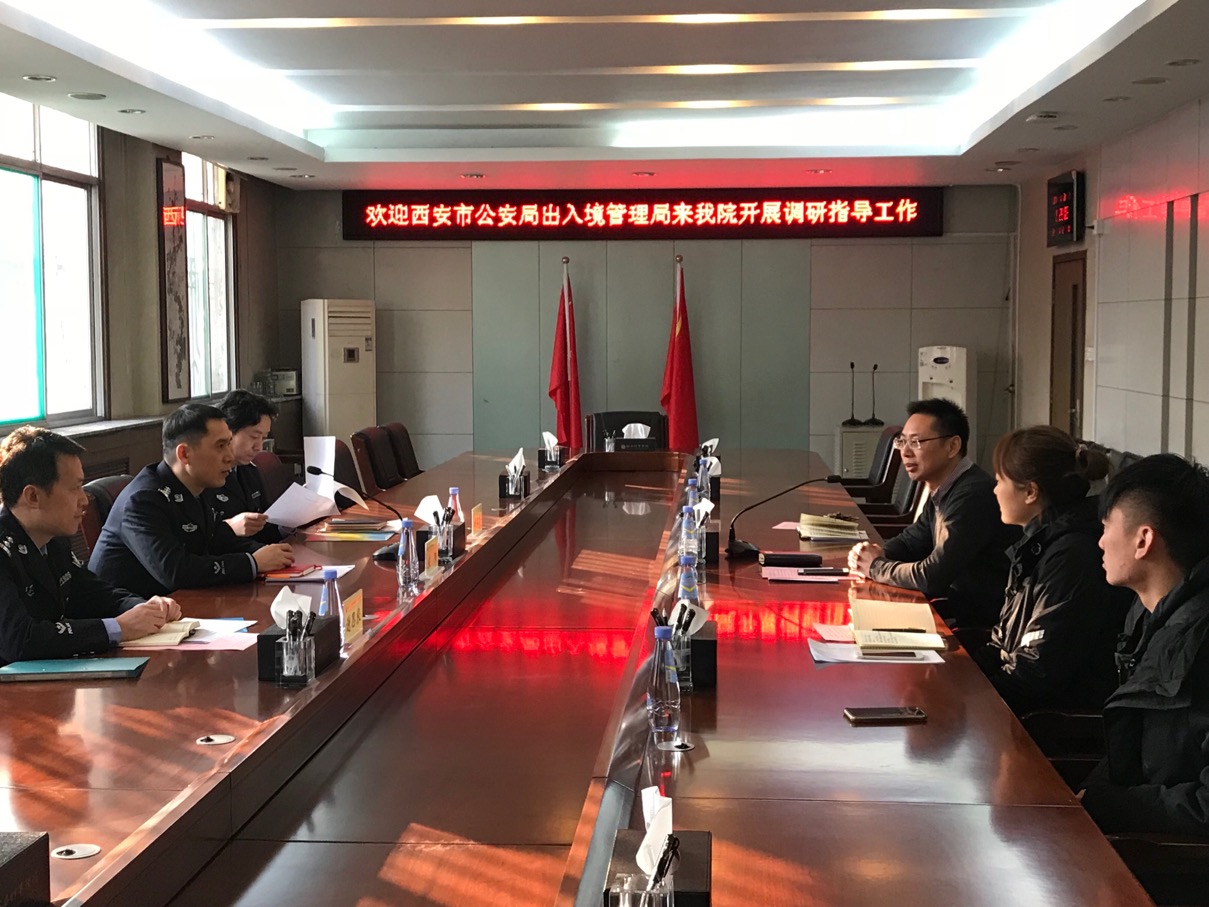 2019年12月20日上午,西安市公安局出入境管理局宋阳副局长一行来万象城调研指导工作,国际交流中心朱军主任会见了宋阳副局长一行,国际交流中心办公室工作人员参加了调研和座谈。