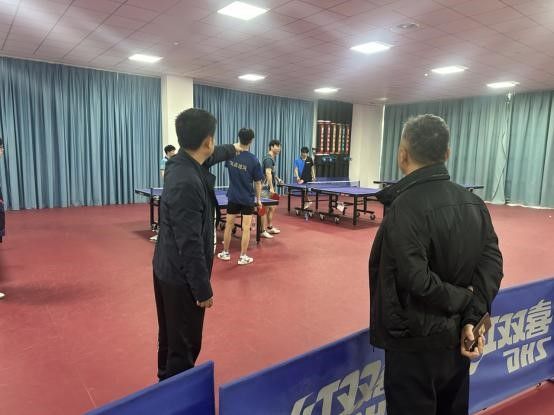 乒乓球馆内,督导组观摩了队员的多球对抗训练和战术分析课。
