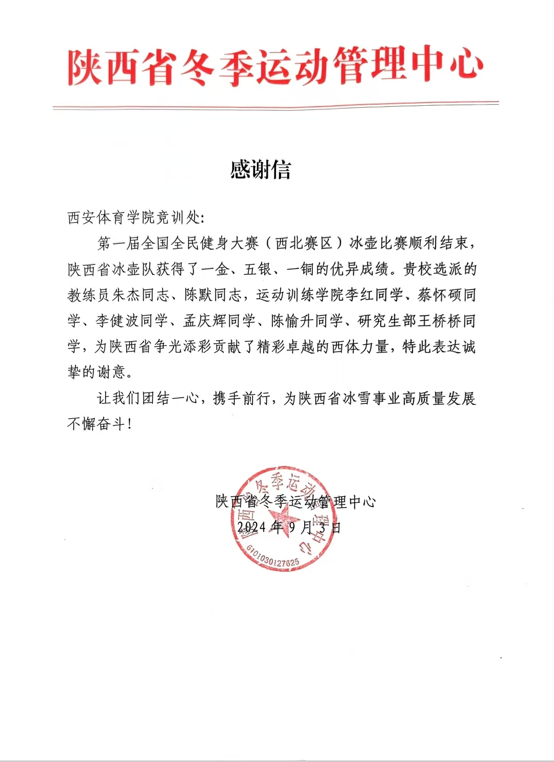 在第一届全国全民健身大赛(西北赛区)冰壶比赛中,陕西省冰壶队荣获一金、五银、一铜佳绩。陕西省冬季运动管理中心特向万象城allwincity官网竞训处及其教练员朱杰、陈默,以及运动员李红、蔡怀硕、李健波、孟庆辉、陈愉升、王桥桥等表示感谢。他们的卓越表现,为陕西省冰雪事业增光添彩。期待双方继续携手,推动冰雪运动发展。