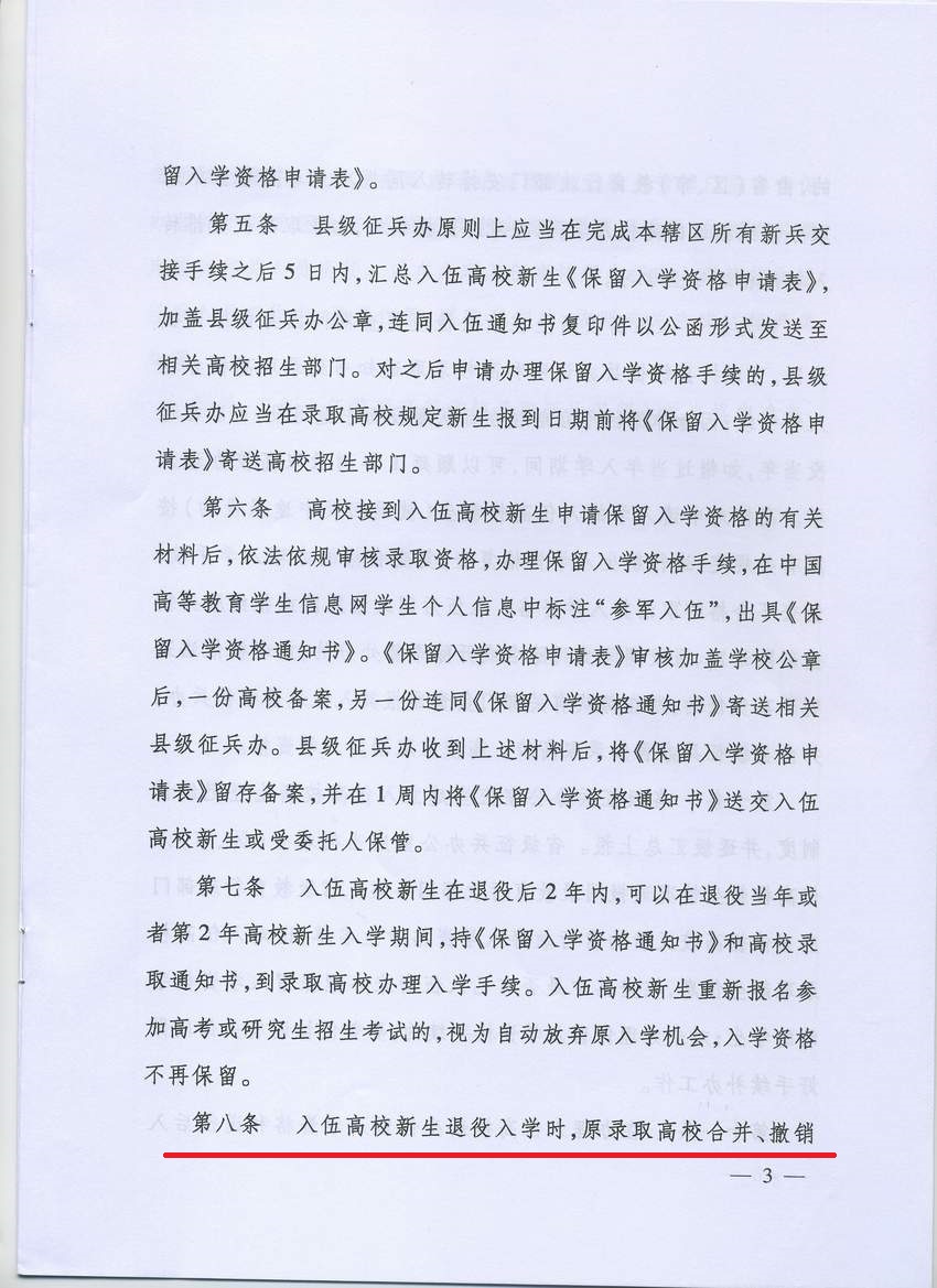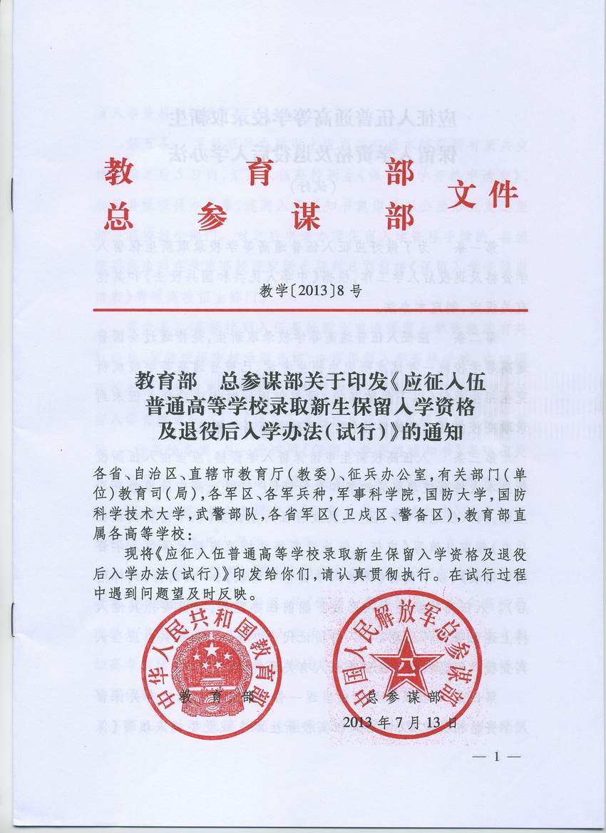 教学[2013]8号_应征入伍普通高等学校录取新生保留入学资格及退役后入学办法(试行) (1)