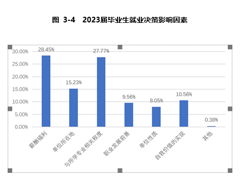 根据对2023届毕业生问卷调查反馈,其中影响毕业生就业决策的最主要的影响因素有“薪酬福利”(28.45%)、“单位所在地”(15.23%)、“与所学专业相关度”(27.77%)。