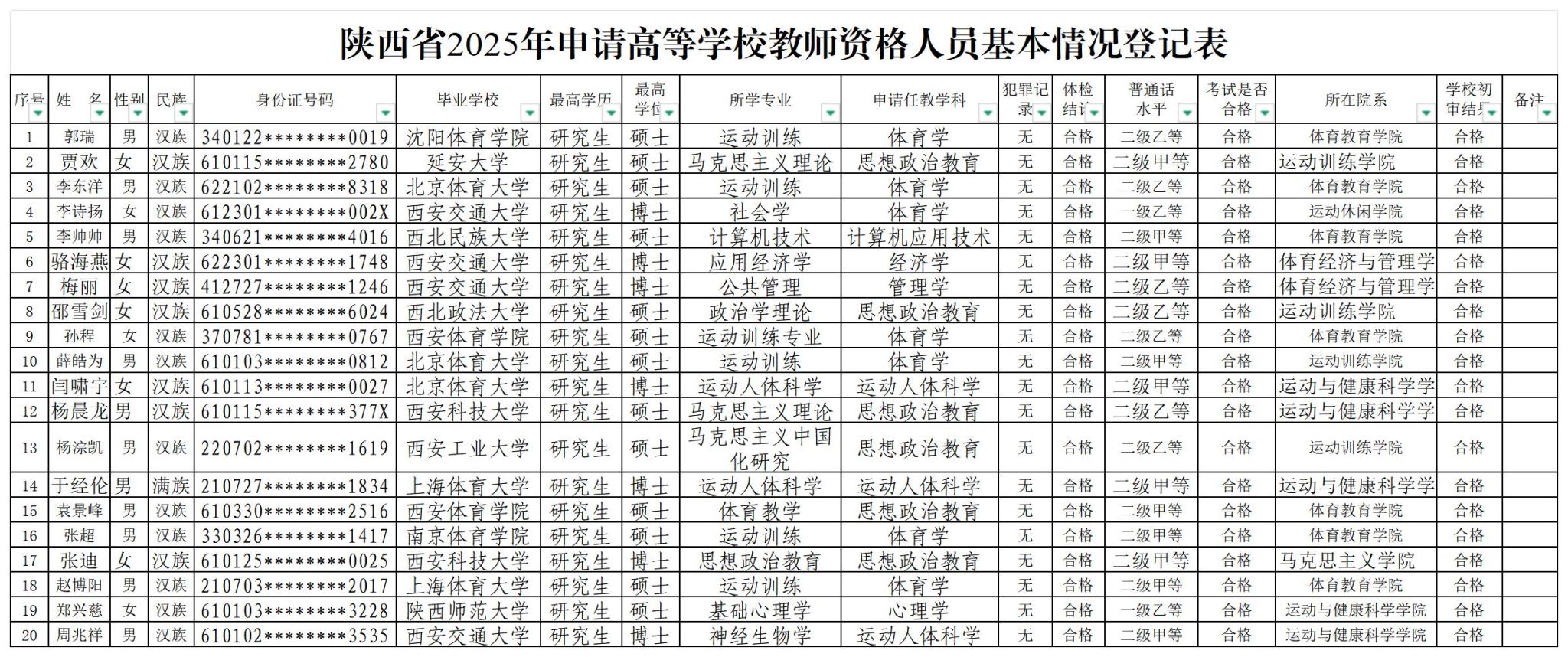 根据《陕西省教育厅办公室 关于做好2025年全省高等学校教师资格专业技能考试与认定工作的通知》(陕教师办〔2025〕4 号)要求,现将万象城参加2024年教师资格教育基础理论知识考试合格,符合陕西省2025年申请高等学校教师资格人员基本情况予以公示,公示期5个工作日(2025年6月23日-2025年6月27日,如有异议,请于2025年6月27日前向人事处或校纪检监察部门客观如实地反映公示对象的情况。