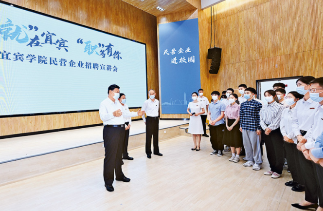 2022年6月8日,中共中央总书记、国家主席、中央军委主席习近平在四川考察。这是8日下午,习近平在宜宾学院考察时,向正在参加企业招聘宣讲会的教师、学生、企业负责人了解企业招工需求和毕业生签约率等情况。 新华社记者 李学仁/摄