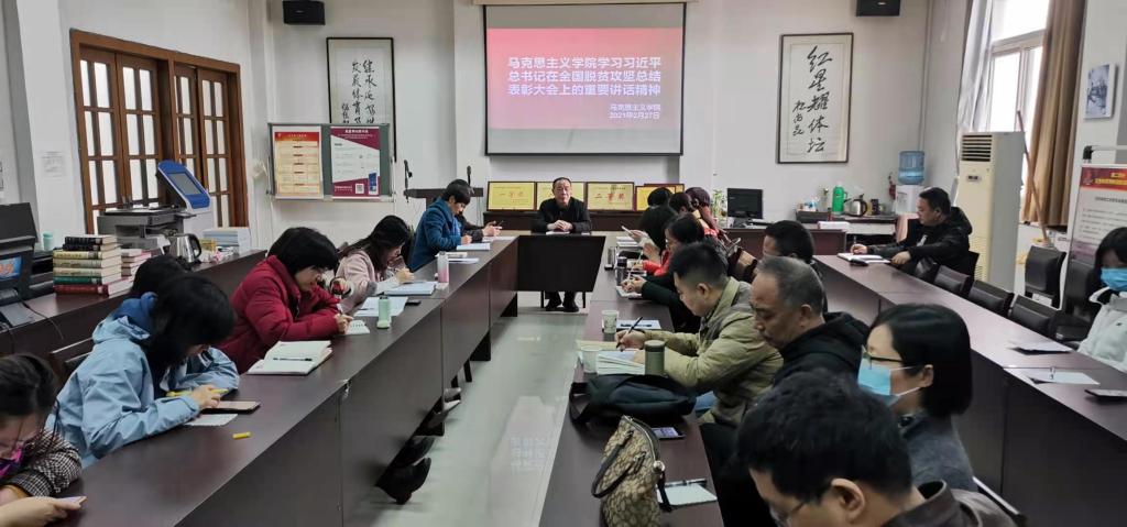 2月27日上午,马克思主义学院在图书馆三层会议室集中学习习近平总书记2月25日在全国脱贫攻坚总结表彰大会上的重要讲话精神,习近平总书记在大会上发表的重要讲话生动阐述了“上下同心、尽锐出战、精准务实、开拓创新、攻坚克难、不负人民”的脱贫攻坚精神,对巩固拓展脱贫攻坚成果,全面实施乡村振兴战略,不断增强人们群众的获得感、幸福感、安全感提出了明确要求。在今后的工作中我们要深入学习贯彻落实全国脱贫攻坚总结表彰大会精神,真抓实干、埋头苦干,以优异成绩迎接建党100周年。
