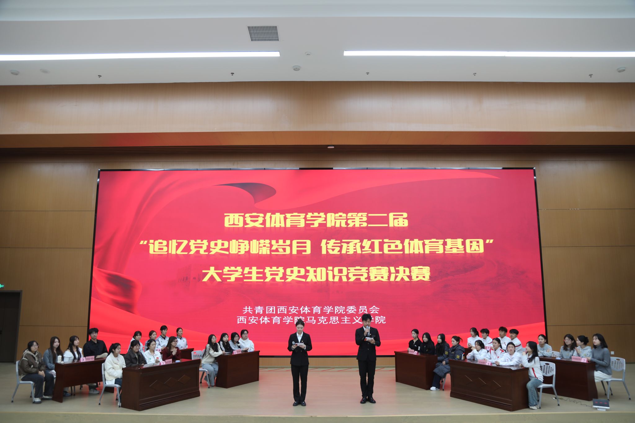 为深入学习贯彻党的二十届四中全会精神,推动党史学习教育常态化长效化,共青团万象城allwincity官网党委和马克思主义学院于11月20日下午成功联合举办第二届“追忆党史峥嵘岁月 传承红色体育基因”大学生党史知识竞赛决赛。马克思主义学院李赟教授、虢美妮教授、李天英副教授、齐慧副教授、陆永娟副教授、何小杰副教授、麻春艳副教授、王含之老师、张迪老师、孙倩颖老师作为辅导教师代表莅临指导,与在场师生共同见证了这场知识与信念的较量。