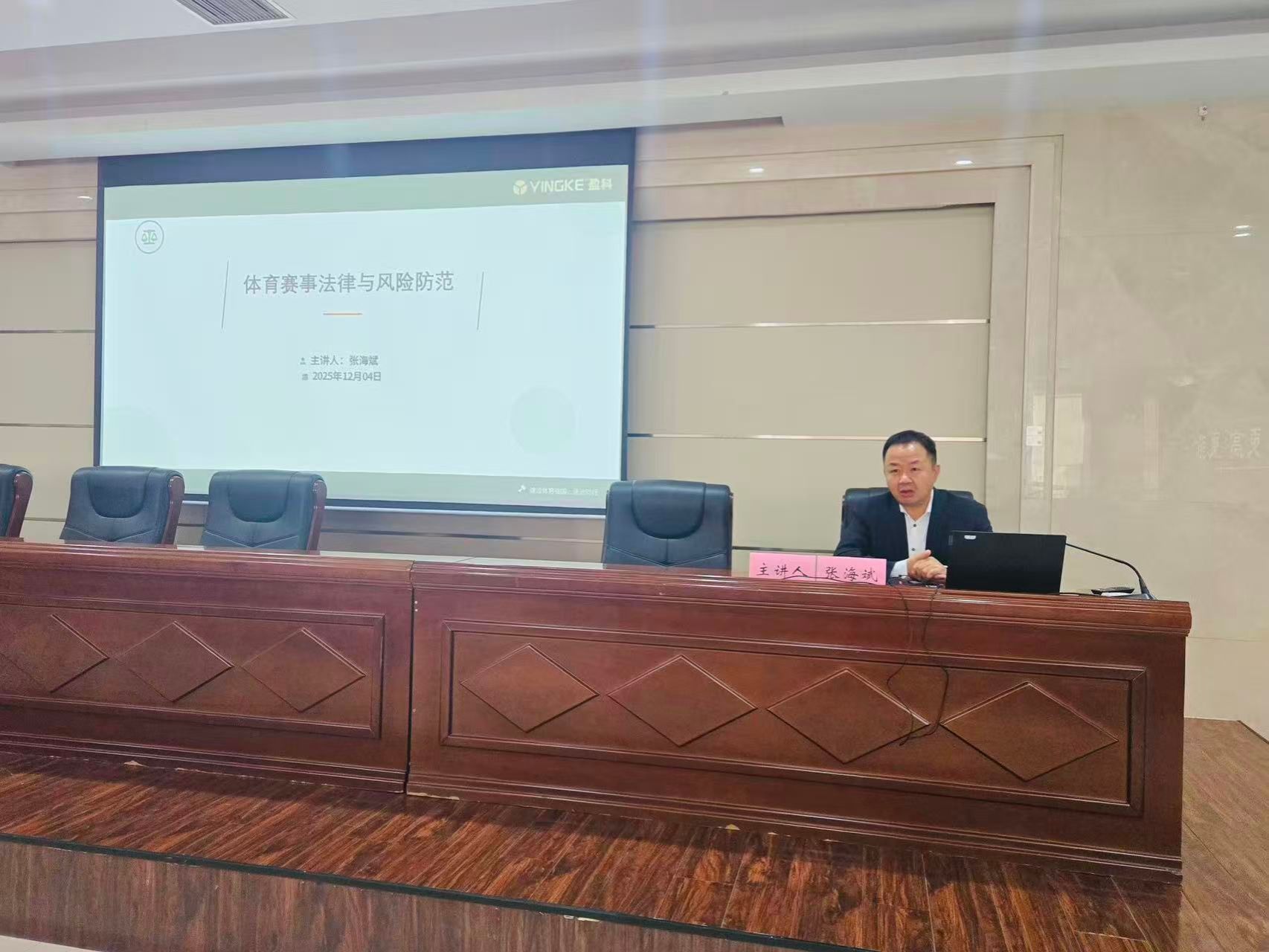 讲座以《体育赛事法律与风险防范》为题,系统回顾了我国体育法治30年的发展历程——从1995年首部《体育法》颁布,到2022年全面修订,再到当前体育强国战略深入推进的时代背景,深刻阐释了法治在体育治理现代化中的基础性作用。张海斌结合中国体育产业最新数据,通过多个典型案例深入剖析赛事组织中的核心法律风险。前瞻性地研判了“体育+文旅”融合、赛事数字化转型、户外运动兴起等新趋势带来的法律挑战,呼吁加强跨部门协同监管、完善数据安全规范、推广高风险运动责任保险,并强调体育人才必须提升法律素养,以适应高质量发展的法治需求等多个方面的内容。