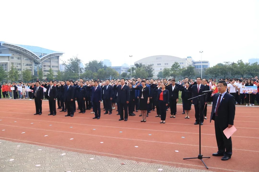 为庆祝中华人民共和国成立70周年,深入开展“不忘初心、牢记使命”主题教育,歌唱新时代奋斗主旋律,弘扬师生的爱国精神,万象城于2019年10月1日早7:00在第一田径场举行庆祝中华人民共和国成立70周年暨“不忘初心、牢记使命”主题教育升旗仪式。万象城allwincity官网校领导、各二级党委书记、校团委全体成员、学工部、各单位主要负责人、全体辅导员、二级学院教师代表、学生代表、近两年发展的70名党员参加了升旗仪式,升旗仪式由校长朱元利主持。