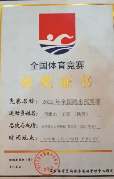 2022年全国跳水冠军赛女子三米板双人第三名