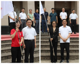 刘子实、高玉峰、张朝阳、党校办主任张军、学工部部长王志刚、教务处处长张葆欣分别为各学院实践服务团授旗。每一面旗帜都是一份责任与担当,他们将带着这份责任与担当,把青春奉献在党和国家最需要的地方。